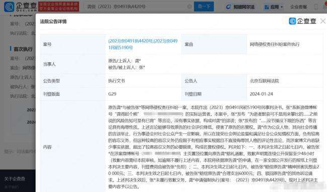 企查查APP显示,近日,因张某未履行致歉义务,龚俊申请强制执行,北京互联网法院公告龚俊与张某网络侵权责任纠纷一案判决书主要内容。