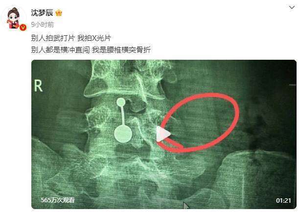 1月27日,沈梦辰在社交平台上晒出去医院检查腰伤的视频片段,并发文称:“别人拍武打片,我拍X光片。别人都是横冲直闯,我是腰椎横突骨折。”