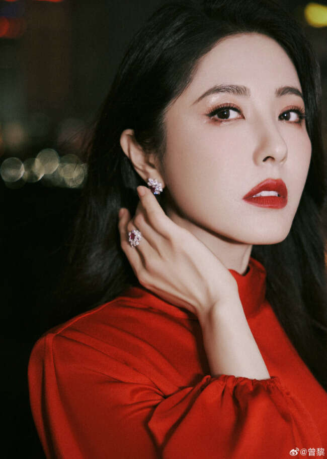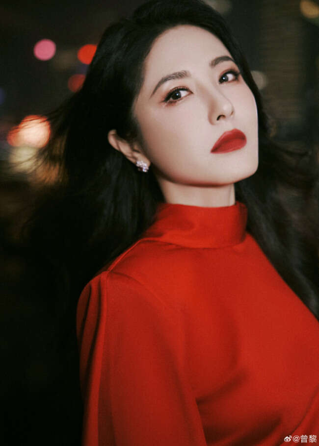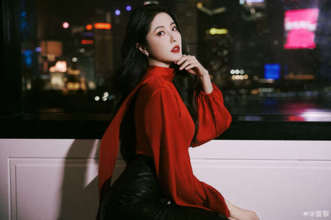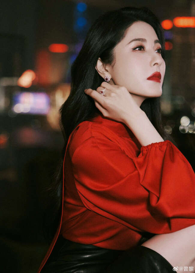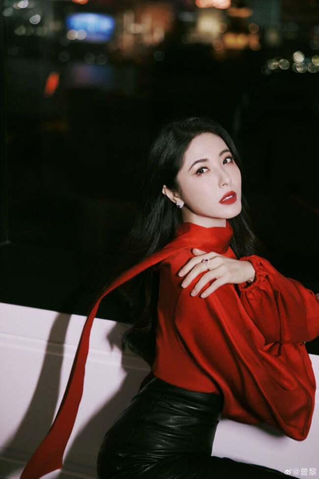 曾黎身穿大红色上衣搭配黑色皮裙,烈焰红唇尽显优雅明媚。