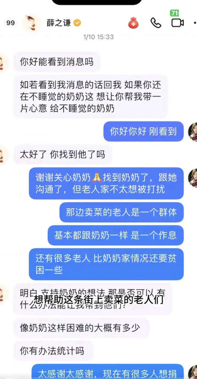 近日,有网友分享一则帮助卖菜老人的视频,他们买下老人们的菜,再送给一些环卫工人、工友。据该网友透露,此举是受薛之谦所托,薛之谦因看到老人通宵卖菜的视频,通过私信找上该网友,托他们帮忙买菜帮助这些老人。