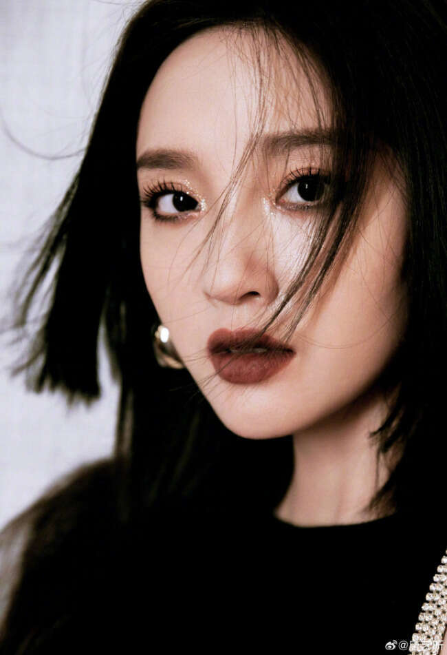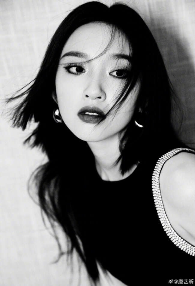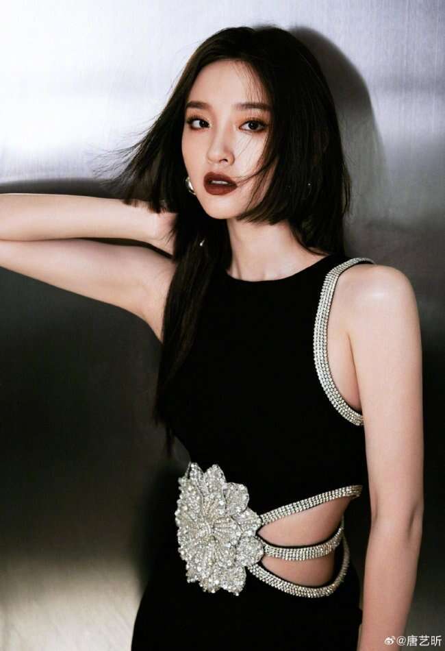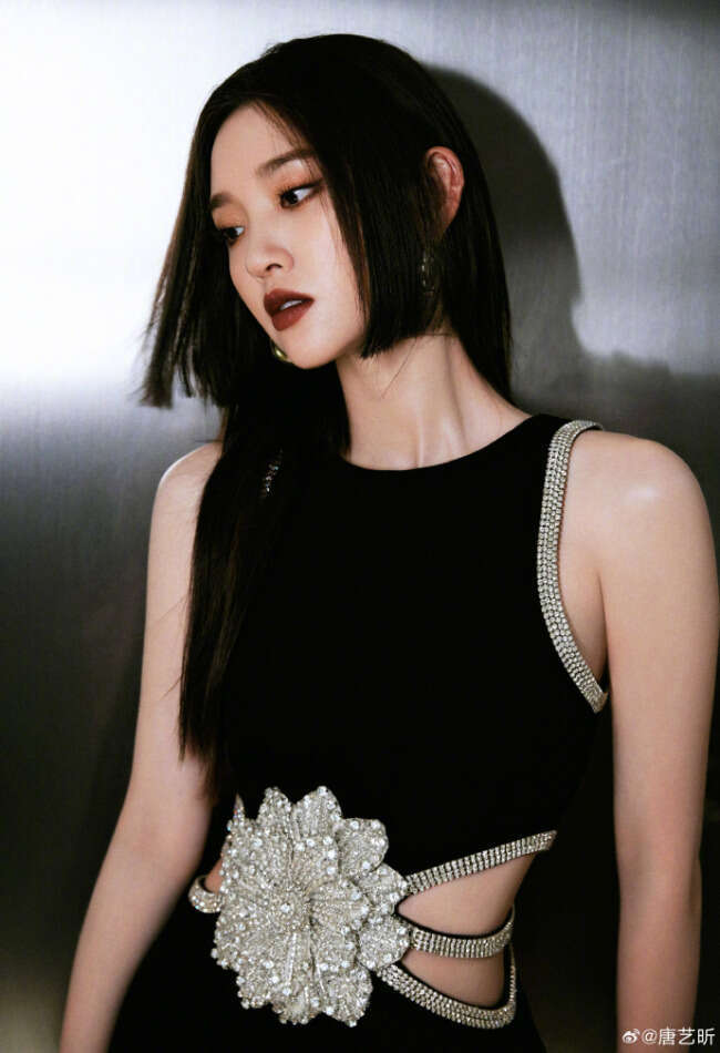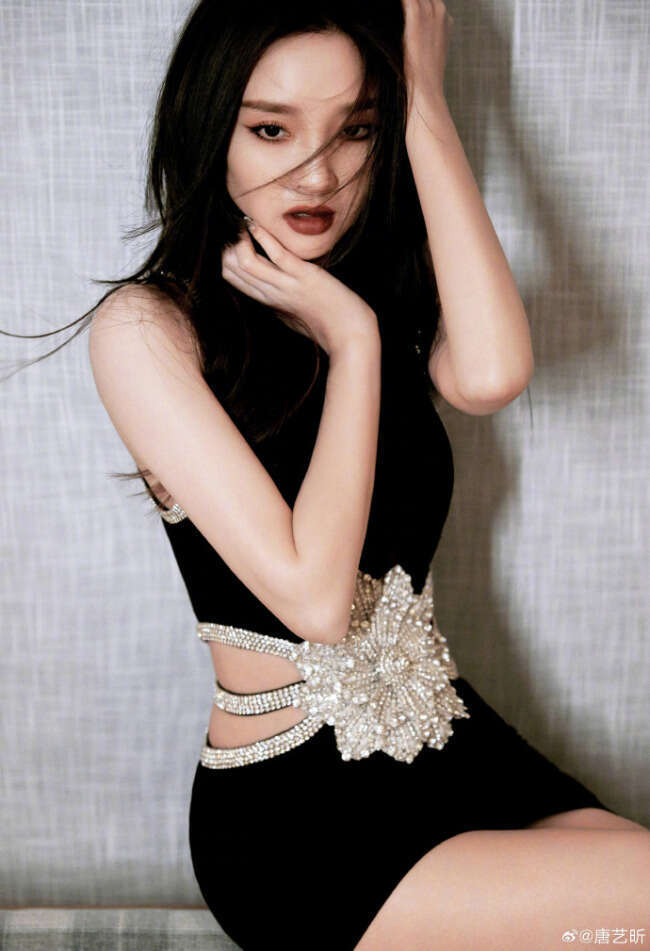 唐艺昕晒出一组写真,她穿黑色紧身裙,银色花边镶腰间身材苗条。