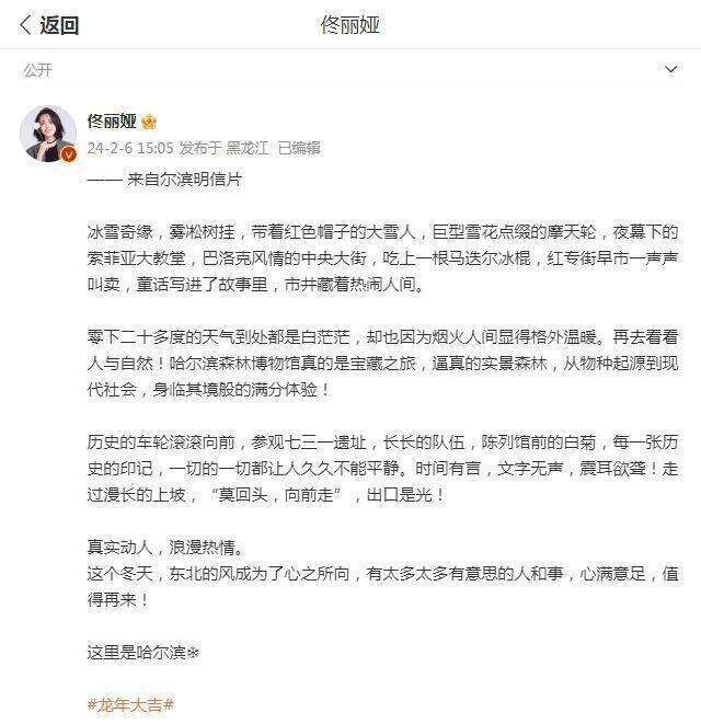 2024年2月6日,佟丽娅罕见在个人的社交平台上分享了一组十八宫格的美照,记录了自己前往哈尔滨游玩的行程,而且最后她还是一副意犹未尽的样子,表示这里有太多太多有意思的人和事,值得再来!