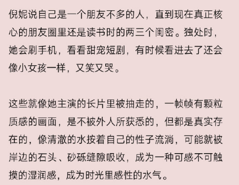 近日,倪妮在接受采访时倪妮称自己是一个朋友不多的人,直到现在真正核心的朋友圈里还是读书时的两三个闺蜜!