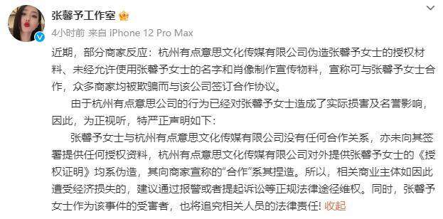 3月21日,张馨予工作室在社交平台上发布严正声明,称与某文化传媒有限公司没有任何合作关系,亦未向其签署提供任何授权资料,该公司对外提供张馨予女士的《授权证明》均系伪造。“相关商业主体如因此遭受经济损失的,建议通过报警或者提起诉讼等正规法律途径维权。同时,张馨予女士作为该事件的受害者,也将追究相关人员的法律责任!”