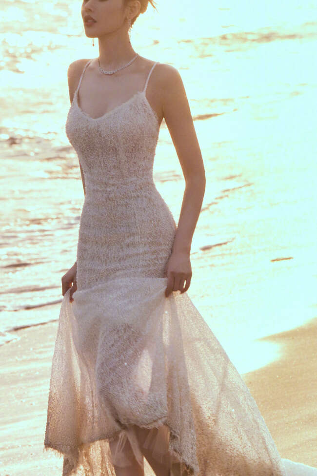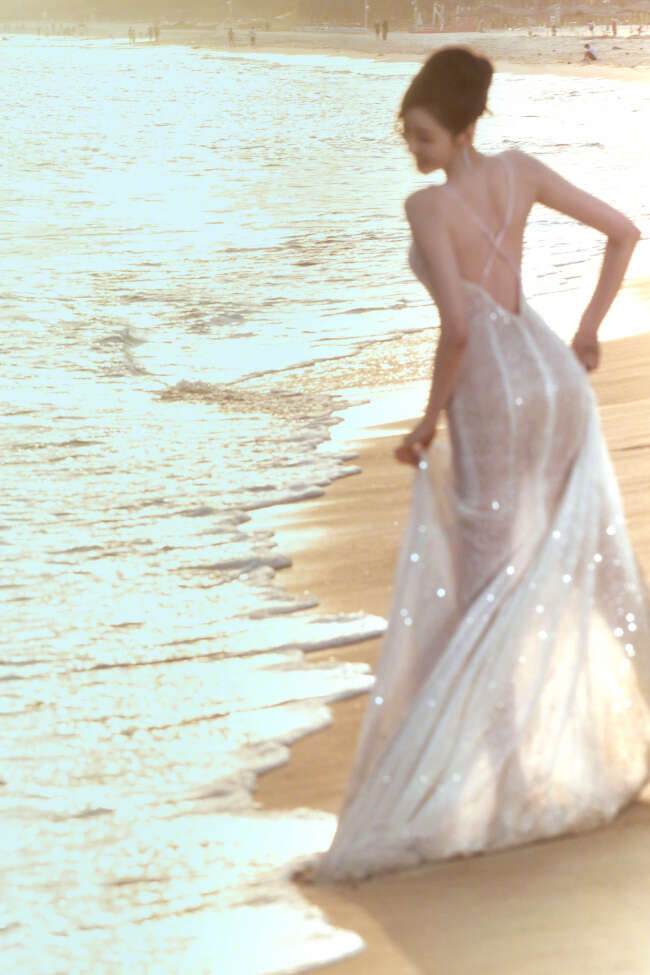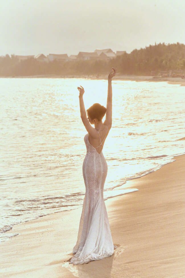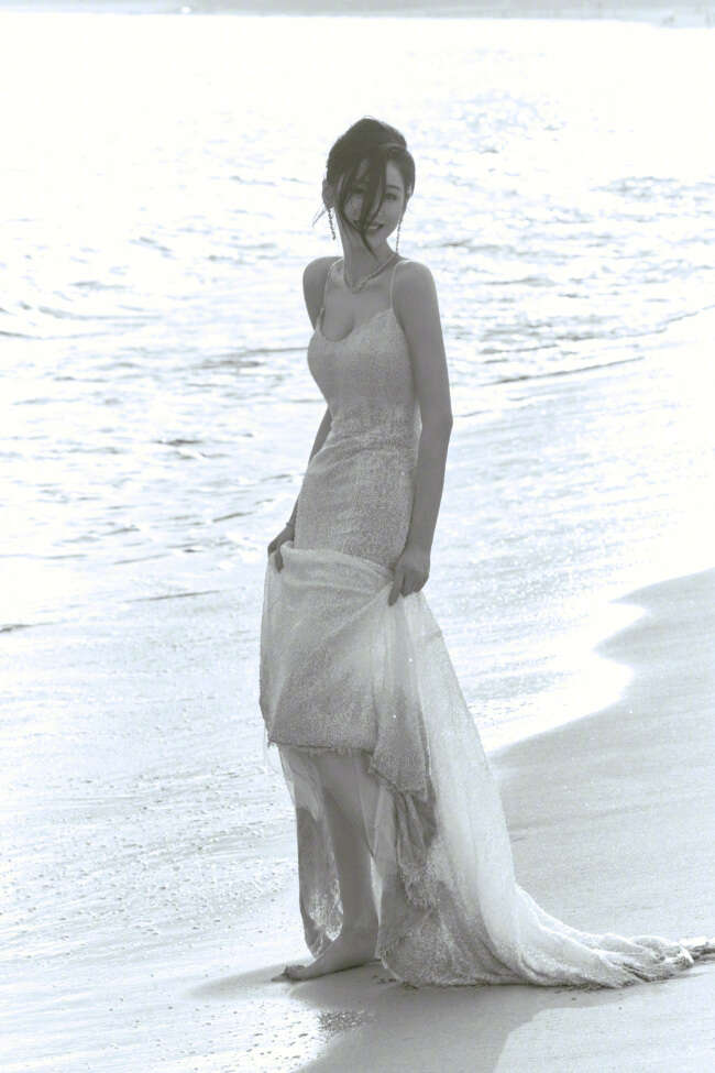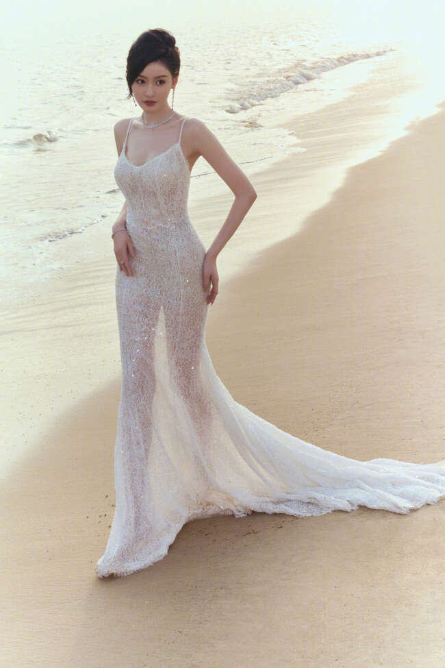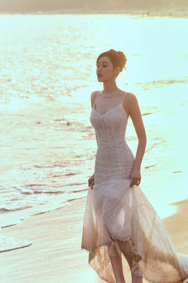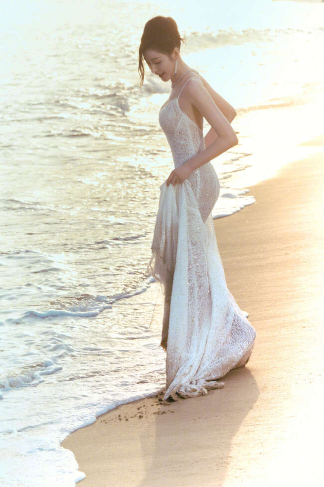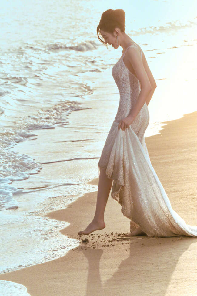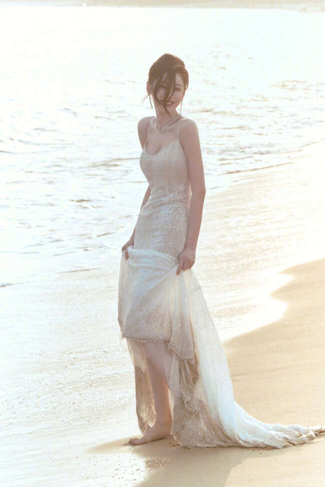 近日,张天爱晒出一组活动图。张天爱穿白色蕾丝吊带裙配慵懒风盘发,赤脚漫步在沙滩上,在日光的照耀下闪闪发光,突显完美的腰臀比例,性感撩人!