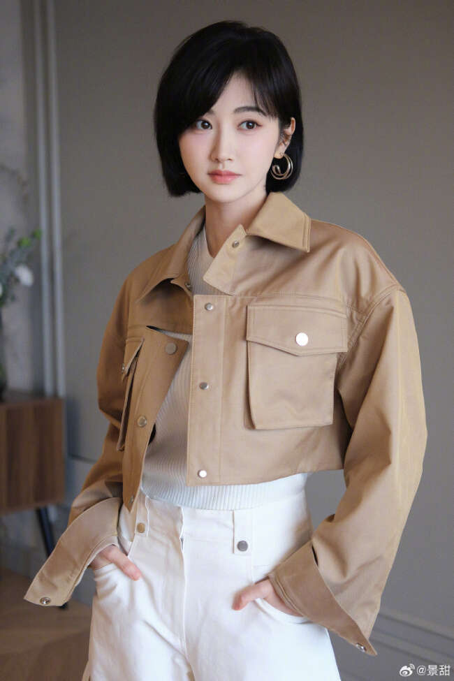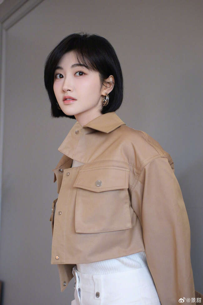 标题:景甜短发搭配驼色皮衣 妆容精致温柔甜美