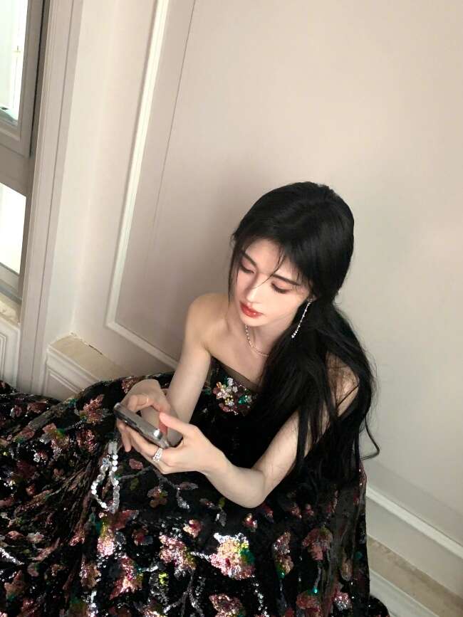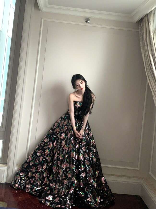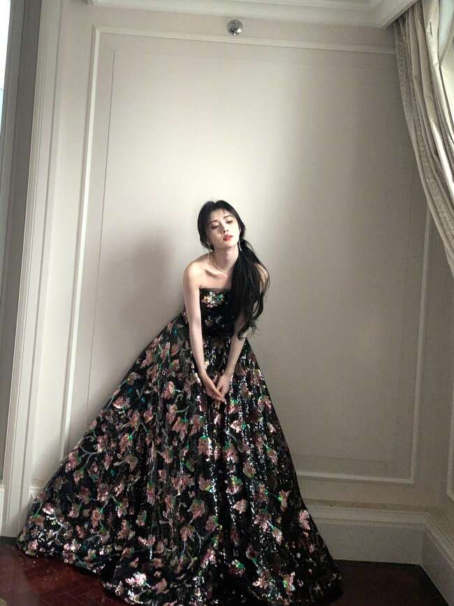 近日,鞠婧祎晒出一组活动造型图。鞠婧祎身穿一袭黑底碎花长裙,宛如夜空中闪亮的繁星,妆容精致媚眼如丝,明艳动人!
