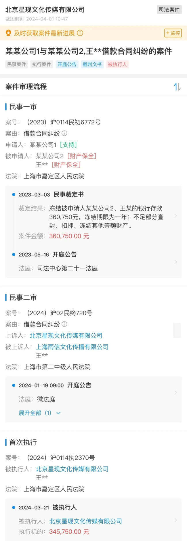 新腕儿报道称拿到了关于原告雨信和被告星现的借款合同和法院二审判决书,星现向雨信借款30万元,借款期1个月,担保人王某某。星现以资方临时撤资有几十万元的缺口为理由,向雨信公司借款30万元。双方签订了借款协议,还款时间约定为1个月,但是已经过去近两年,这笔款项仍然没有还给雨信公司。雨信向法院提起诉讼,要求星现还款,一审法院判决星现还款,但星现表示不服,对此进行了上诉。今年2月份,上海市第二中级人民法院对此案进行了终审判决,驳回了星现的上诉请求,维持原判。由于星现并未还款,雨信公司被迫申请强制执行。雨信先是申请了对星现和王某的财产保全,冻结了相关额度的财产,在二审胜诉后,随后发起了强制执行申请,要求两名被告还款加利息一共345750元。
