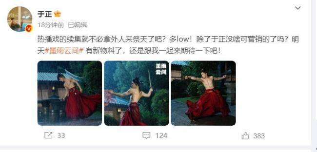 5月16日,于正发文回应当年差点拍《庆余年》,他写道:“热播戏的续集就不必拿外人来祭天了吧?多low!除了于正没啥可营销的了吗?”并晒出了三张自家艺人的照片宣传电视剧。