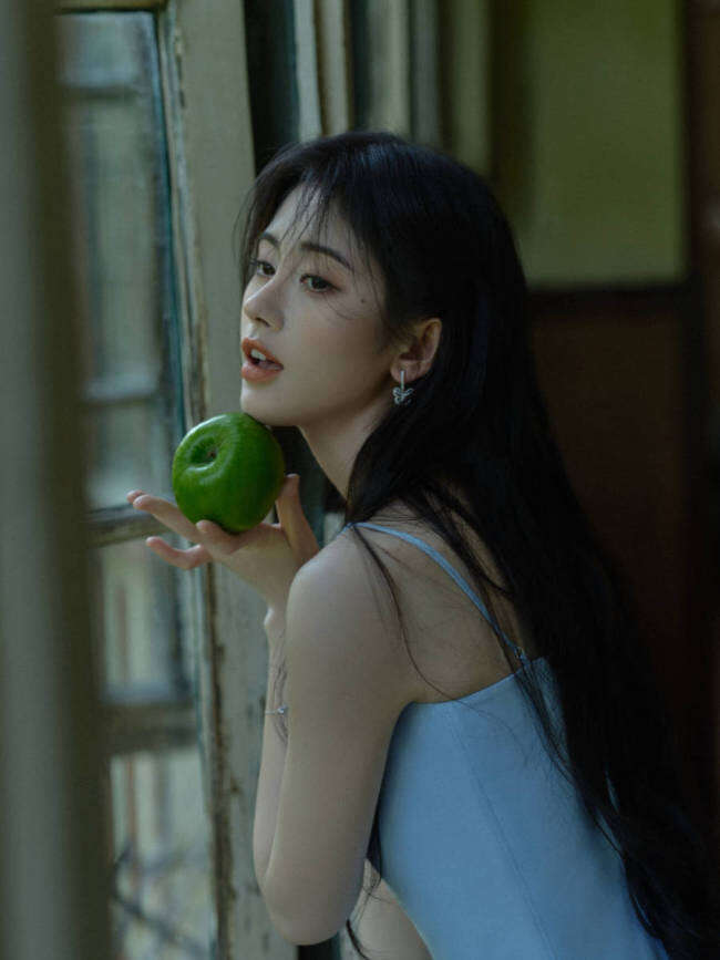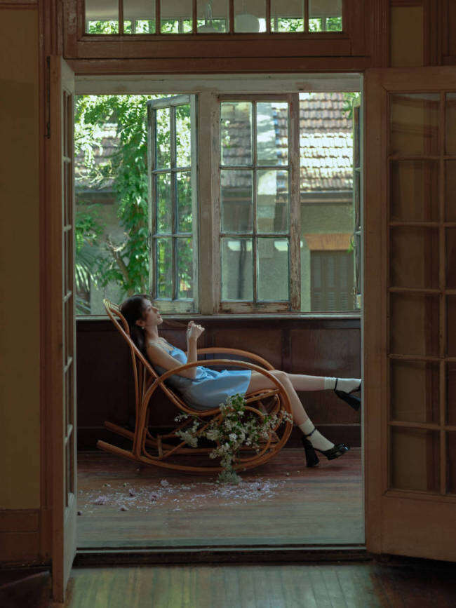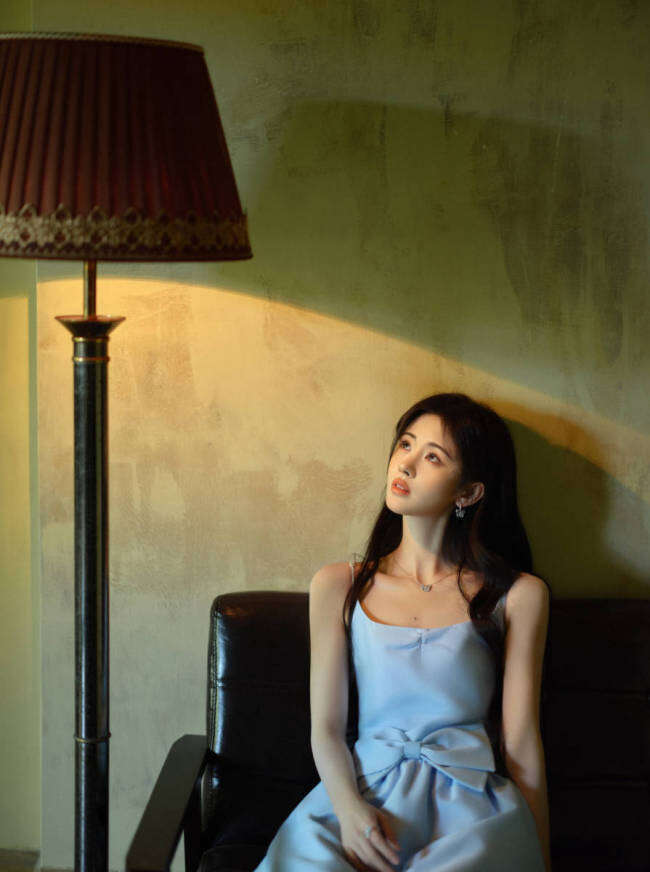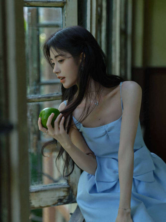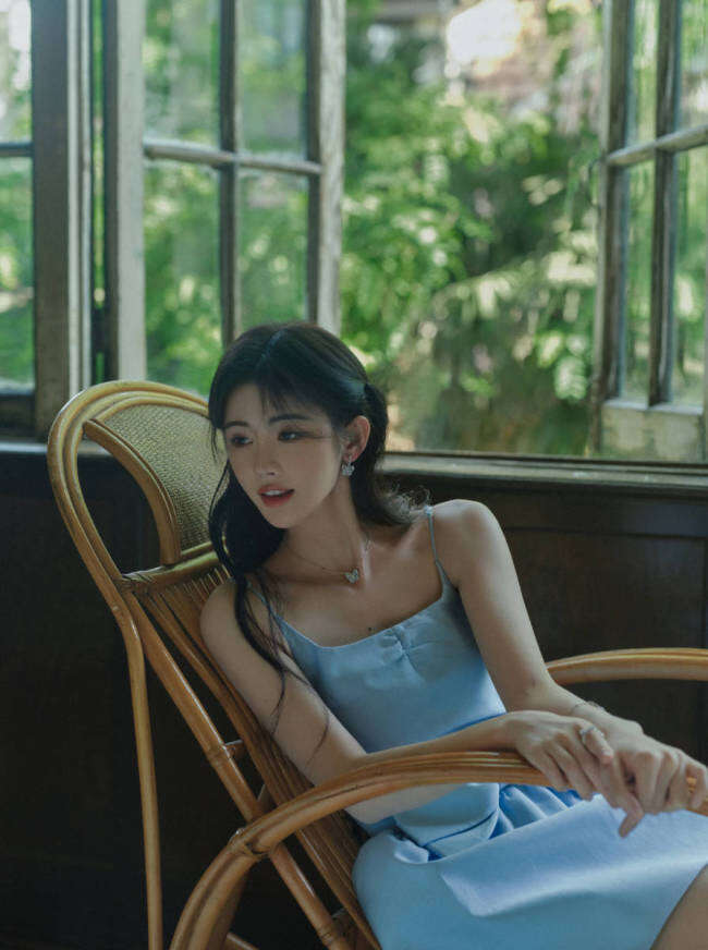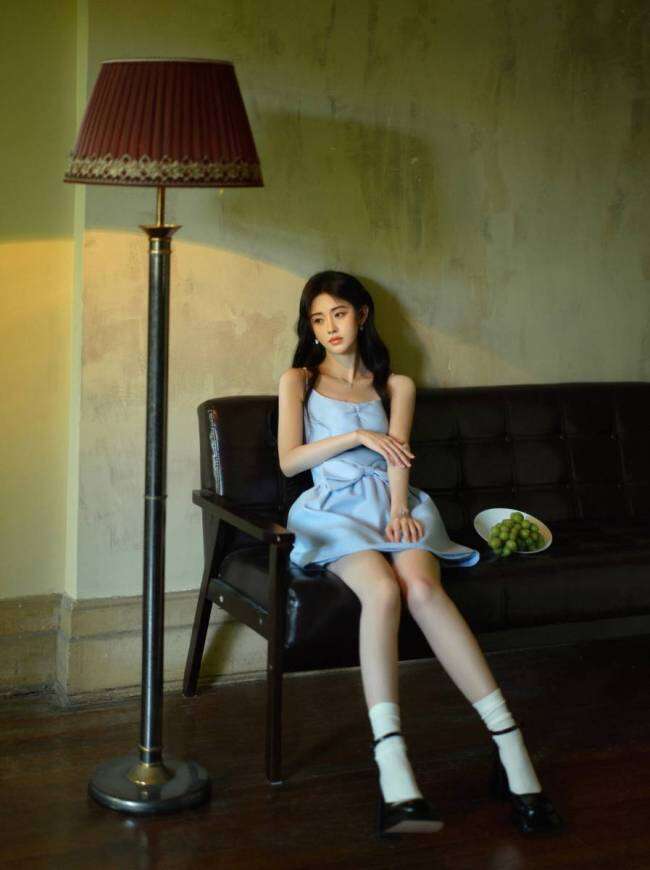 标题:鞠婧祎躺摇椅上肆意自在 穿蓝色短裙气质清纯