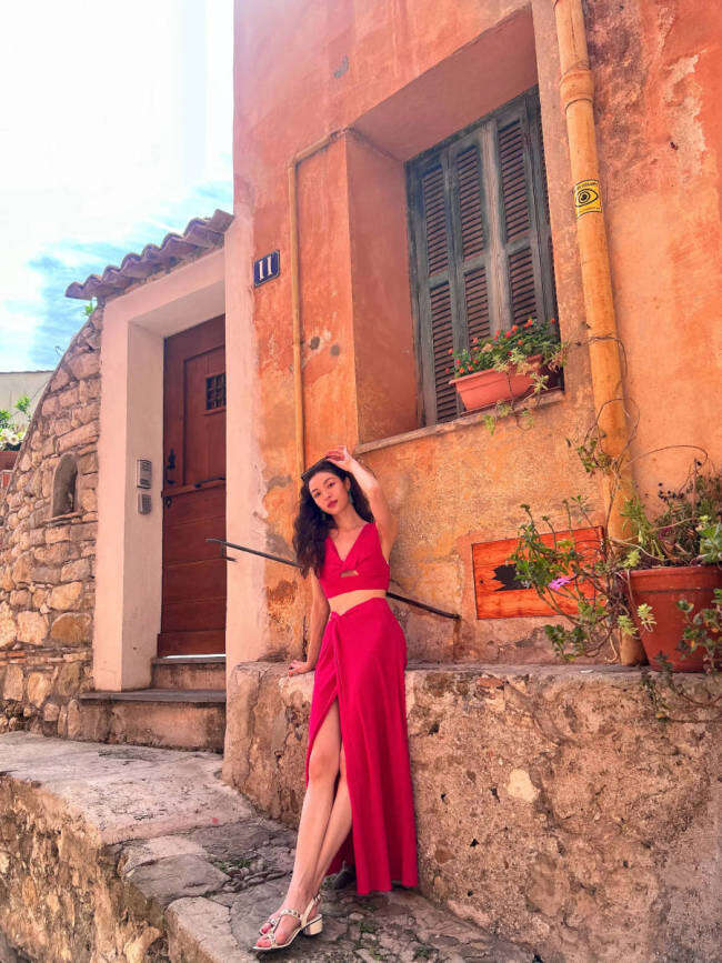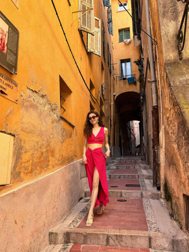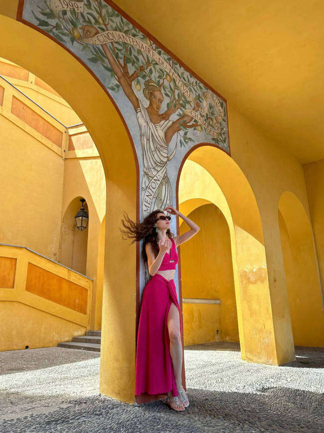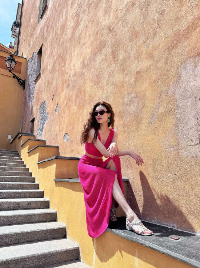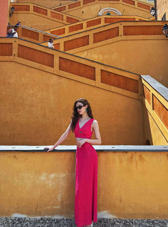 钟楚曦在社交平台上晒出一组夏日游玩照,她漫步阿联酋街头,身穿芭比粉吊带背心,搭配开叉长裙,大方秀蛮腰、美腿,身材傲人!