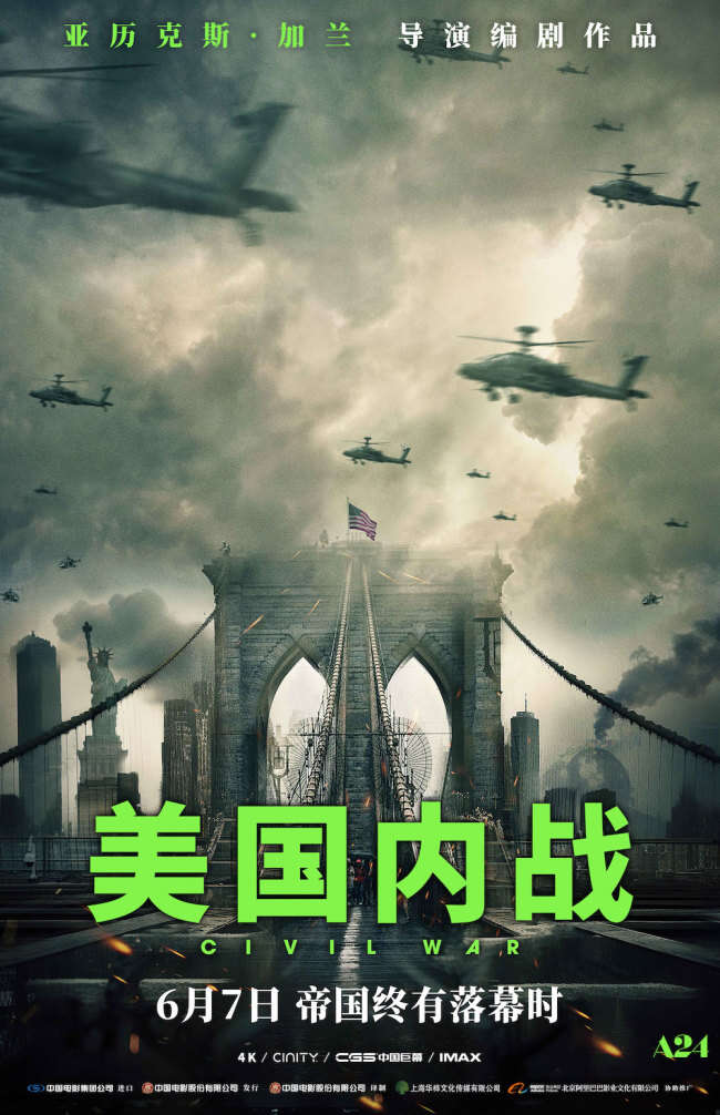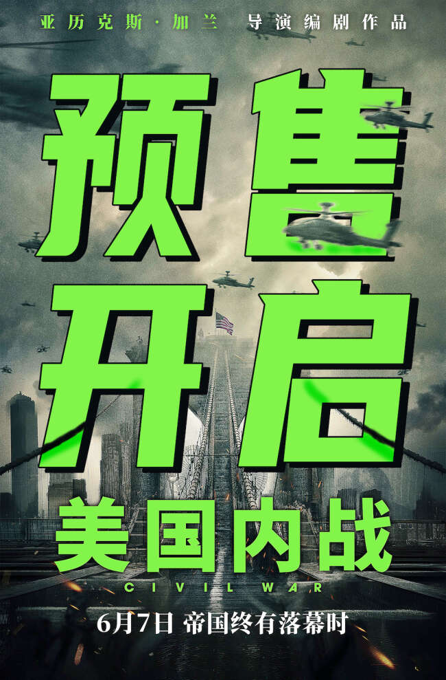电影《美国内战》由美国A24影业出品,导演亚历克斯·加兰自编自导,克斯汀·邓斯特(Kirsten Dunst)、瓦格纳·马拉(Wagner Moura)、斯蒂芬·亨德森(Stephen McKinley Henderson)、卡莉·史派妮( Cailee Spaeny)等主演,中国电影集团公司进口,中国电影股份有限公司发行、译制,上海华桦文化传媒有限公司、北京阿里巴巴影业文化有限公司协助推广。6月7日即将全国上映,目前正在火热预售中。