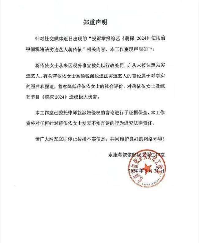 5月31日,蒋依依工作室发郑重声明回应蒋依依参加综艺被举报传闻:“蒋依依女士从未因税务事宜被处以行政处罚,亦从未被认定为劣迹艺人。有关蒋依依女士系偷税漏税违法艺人的言论属于对事实的歪曲和捏造。”