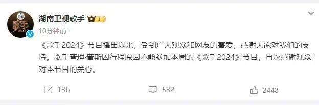 6月12日,《歌手2024》官方发文,正式确认“断眉”查理·普斯因为行程原因,无法参加本周的节目并进行表演。
