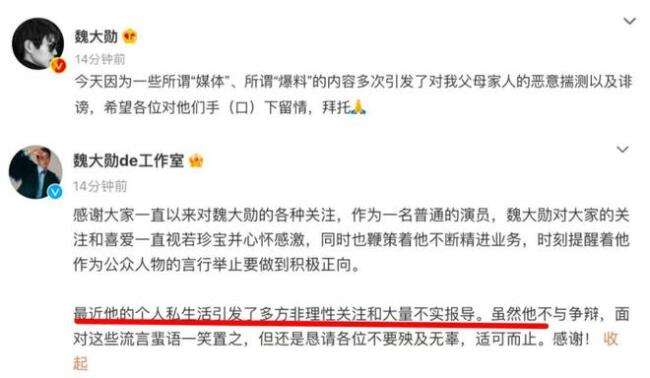 当时,双方就被猜测已经分了,但是没过多久,魏大勋及其工作室发文,称网上有许多不实报导,所以真假难辨。