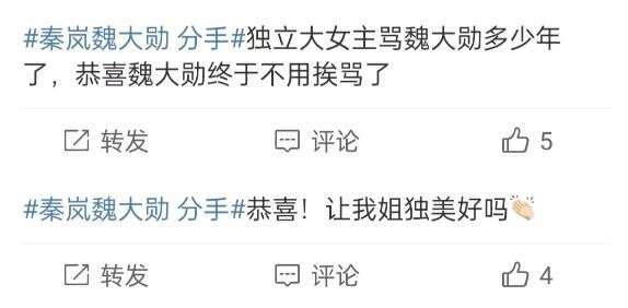 魏大勋粉丝恭喜他回归单身,庆祝他终于不用挨骂了,秦岚粉丝一片叫好,感叹姐姐独美。