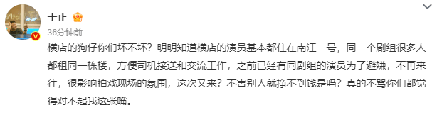 近日,于正发文辟谣王星越向涵之恋情绯闻,并痛骂狗仔:横店的狗仔你们坏不坏?不害别人就挣不到钱是吗?真的不骂你们都觉得对不起我这张嘴。随后被骂的八卦媒体回怼:“狗仔能坏哪里去,狗仔再坏也不会拉人炒作后诅咒人去死”,还表示“害人肯定是挣不着钱了,但抄袭肯定是可以挣到钱。”同时还暗示宋威龙,吴谨言,许凯的绯闻风波也与于正口不择言有关。