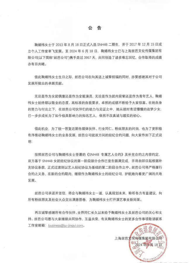 据悉,此前鞠婧祎与经纪公司丝芭因解约风波线上对峙,丝芭文化发布公告称鞠婧祎已续约,但鞠婧祎回应称不知情并宣布到期不续约。