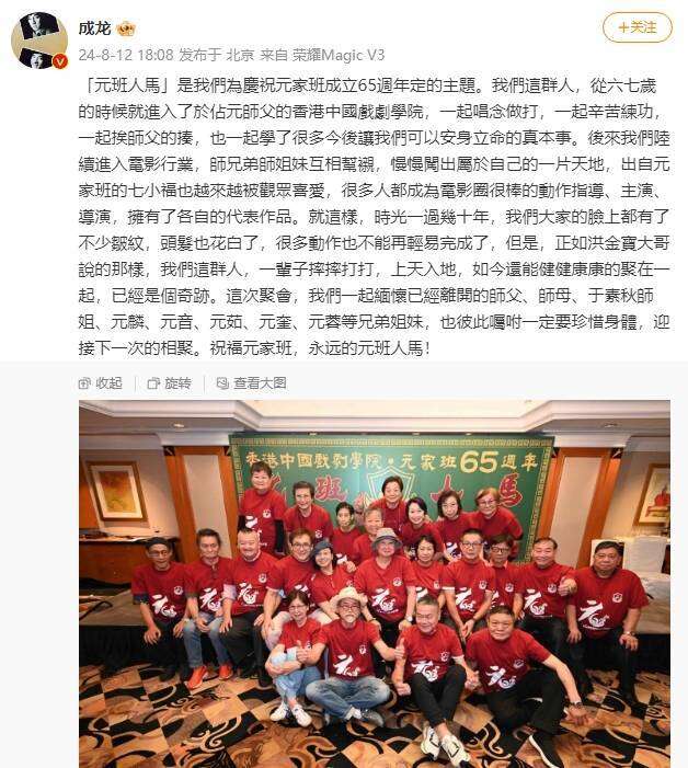 8月12日,成龙在个人社交账号发文,庆祝元家班成立65周年,他在文中也首次透露著名香港导演元奎已经离世,”我们一起缅怀已经离开的师父、师母、于素秋师姐、元麟、元音、元茹、元奎、元蓉等兄弟姐妹。”