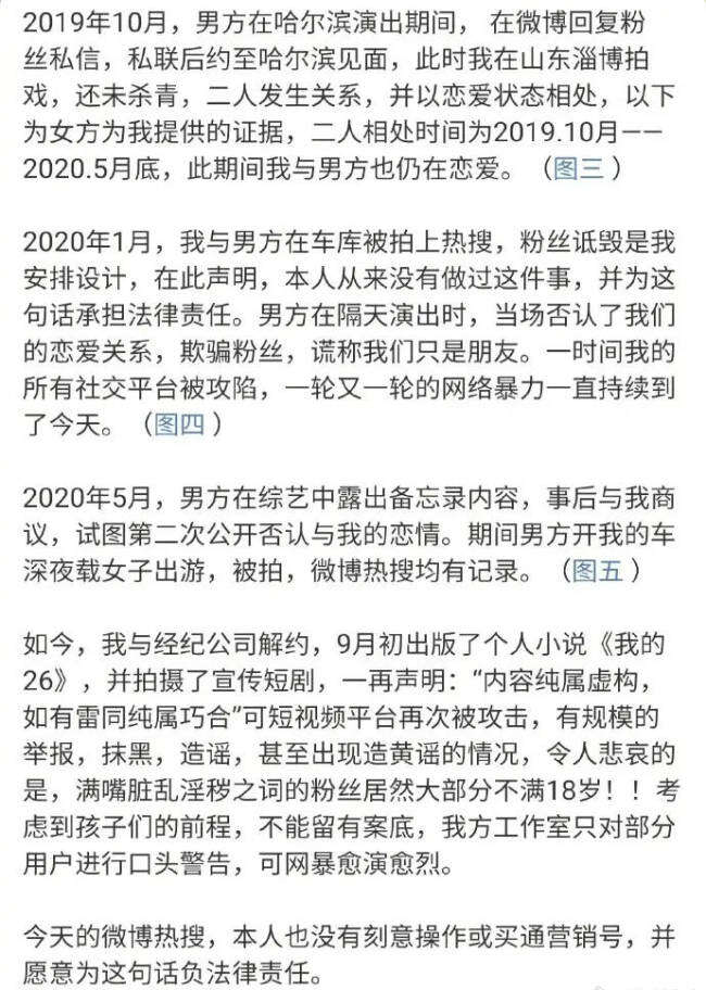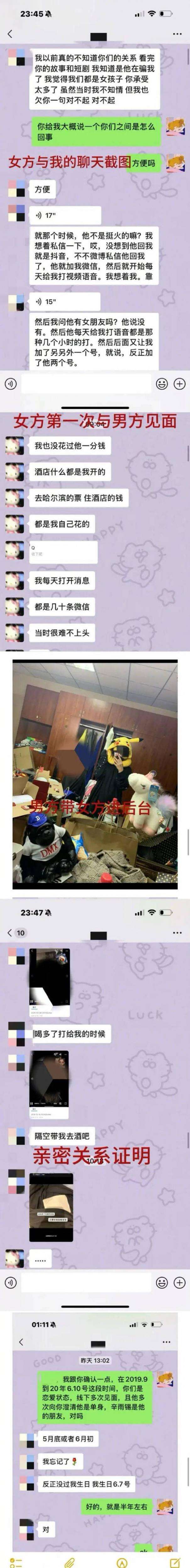 ④2019年10月,男方在哈尔滨演出期间私联粉丝并发生关系,之后更维持了长达半年多的恋爱关系,而其与辛雨锡也一直是恋爱状态并未分手。