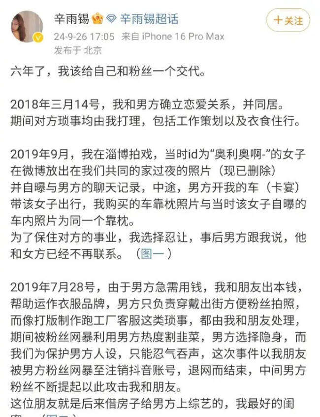 9月26日,秦霄贤前女友辛雨锡发长文,爆料称其恋爱期间出轨,信息量很大。