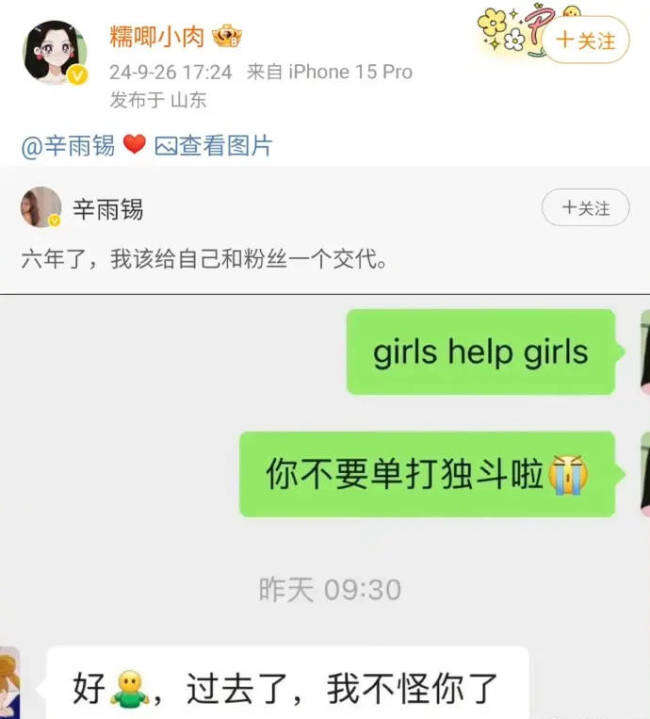 ⑥ 秦霄贤私联的那个粉丝也转发了辛雨锡的微博并晒出聊天记录,girls help girls,辛雨锡表示已经原谅了该女生。