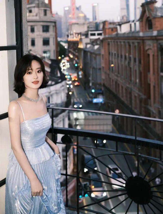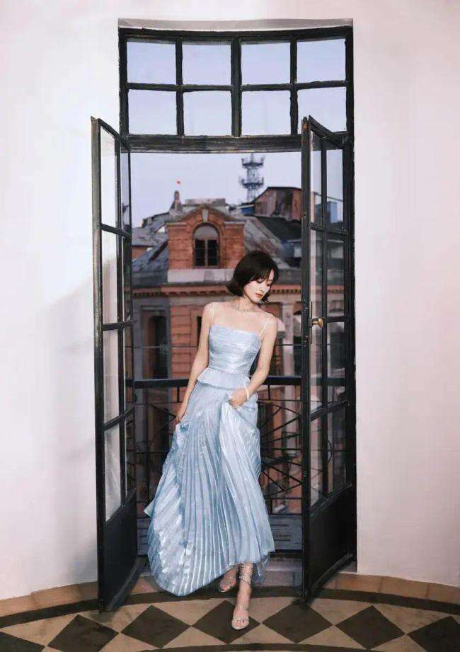 赵丽颖最新的造型组图释出,她身穿一袭水蓝色吊带裙,美丽动人,笑容十分灿烂。