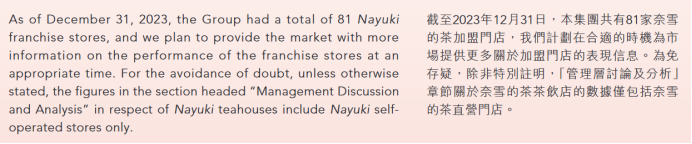 过高的门槛劝退了加盟商,2023年三季报提到,自放开加盟到9月底,两个多月来加盟门店只有4家。年报显示,截至2023年12月31日,奈雪共开设了81家加盟店,这个数字少到奈雪甚至不愿在财报中多提两句。