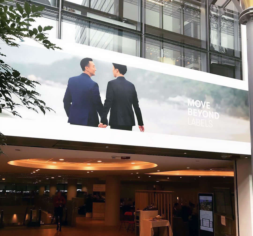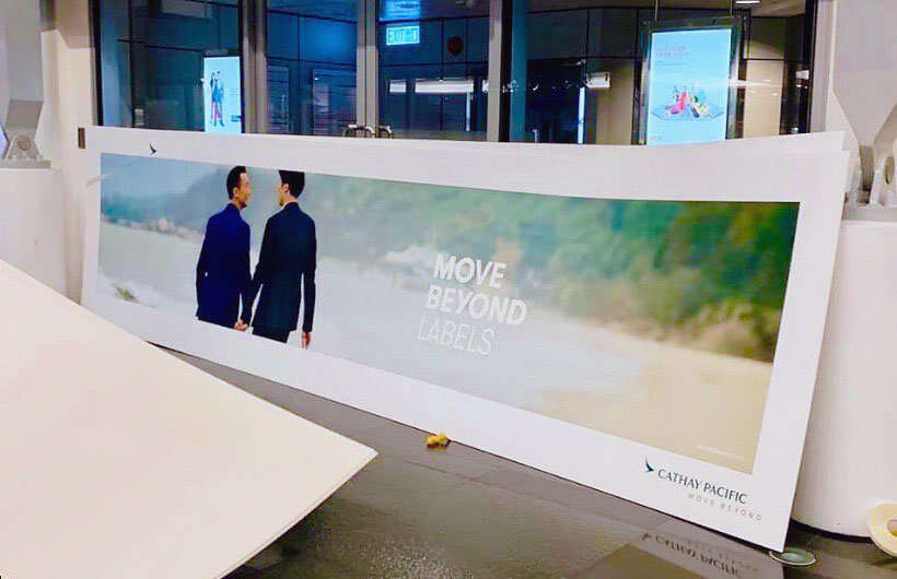 香港国泰航空公司昨午宣布了品牌形象重塑口号“Move Beyond 志在飞跃”,同时国泰城也换上了这个口号的系列平面广告,其中一幅为一对男子牵手漫步沙滩,配以“Move Beyond Labels”文字,寓意“跨越标签”。