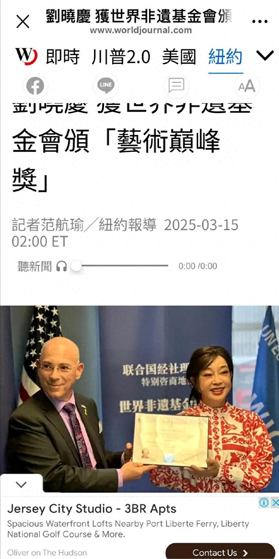 3月15日,她荣获“艺术巅峰奖”,登上纽约的报纸、被高度评价、获联合国颁奖!