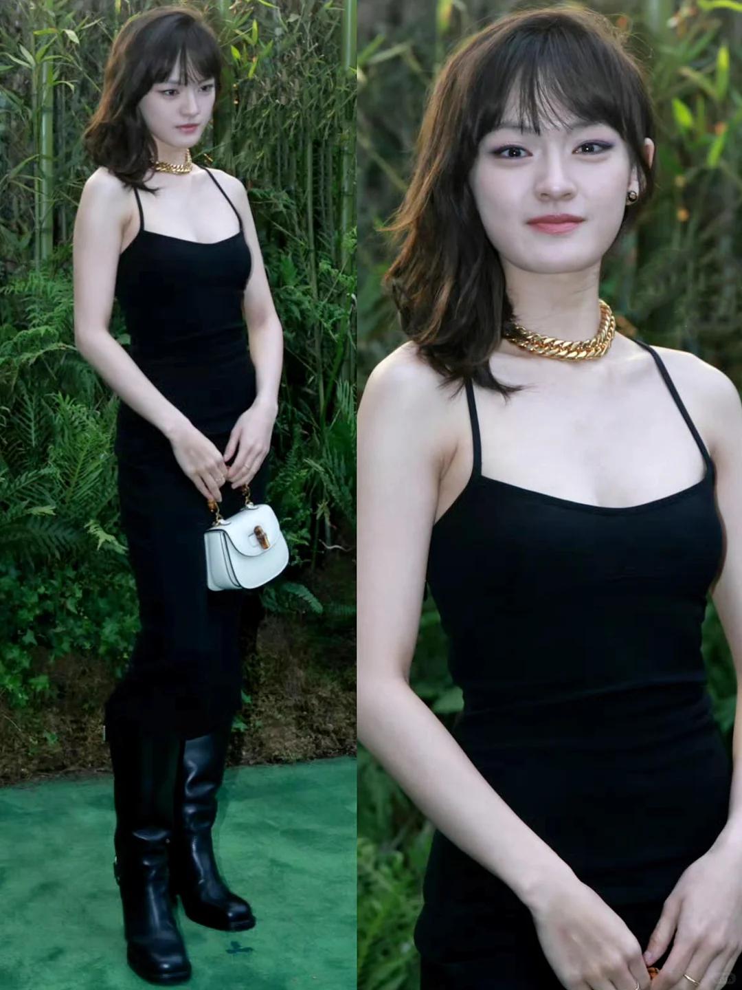这次上海的Gucci之夜,文淇身穿一件黑色吊带裙,造型十分火辣,再配上金属项链,十分朋克风,妆造看上去也像只小猫一样。