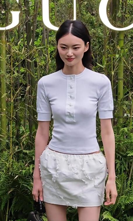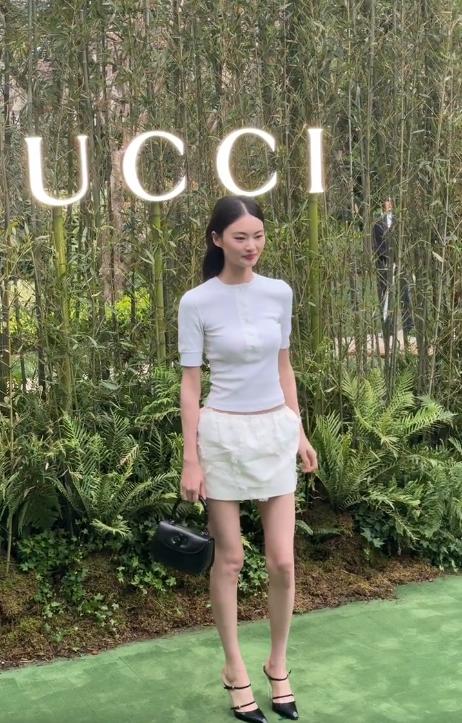 Gucci作为知名时尚品牌,自然要和不少模特合作,这次除了明星,超模贺聪也去了现场。而且与李沁、文淇的一身黑不同,贺聪身穿白色T恤和短裙,造型十分清新。