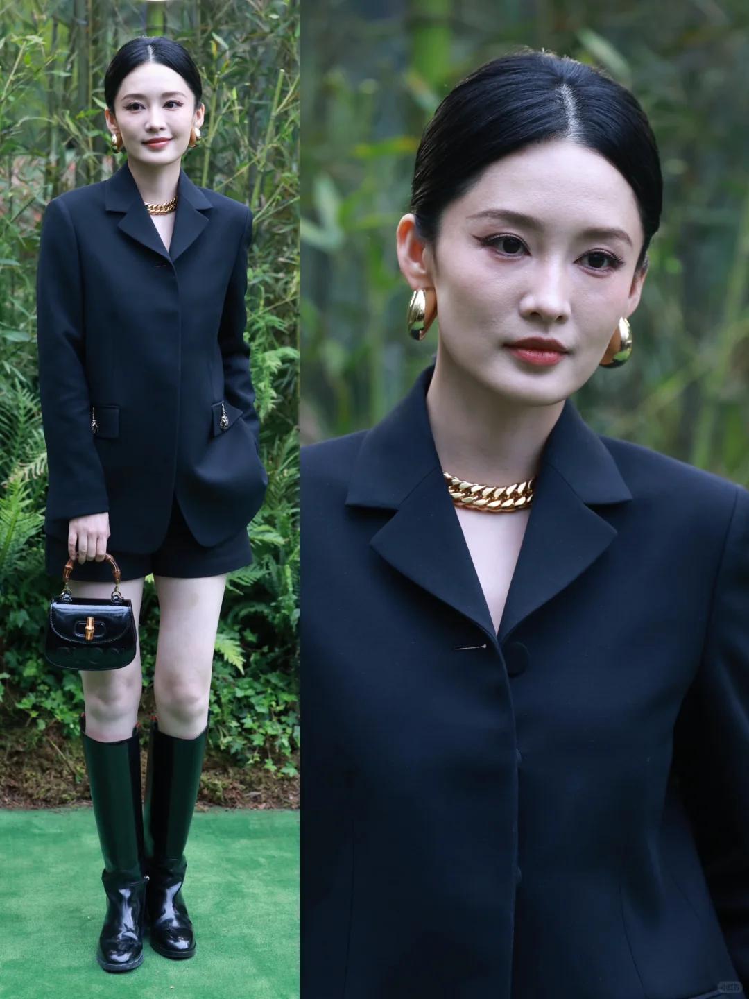 李沁最近好像比较低调,很少参加这类时尚活动。不过这次亮相还是让人眼前一亮,一件黑色修身西装配黑色短裤,再加上中筒靴,整体造型沉稳大气又时尚,一出场就让人感觉气场好强。