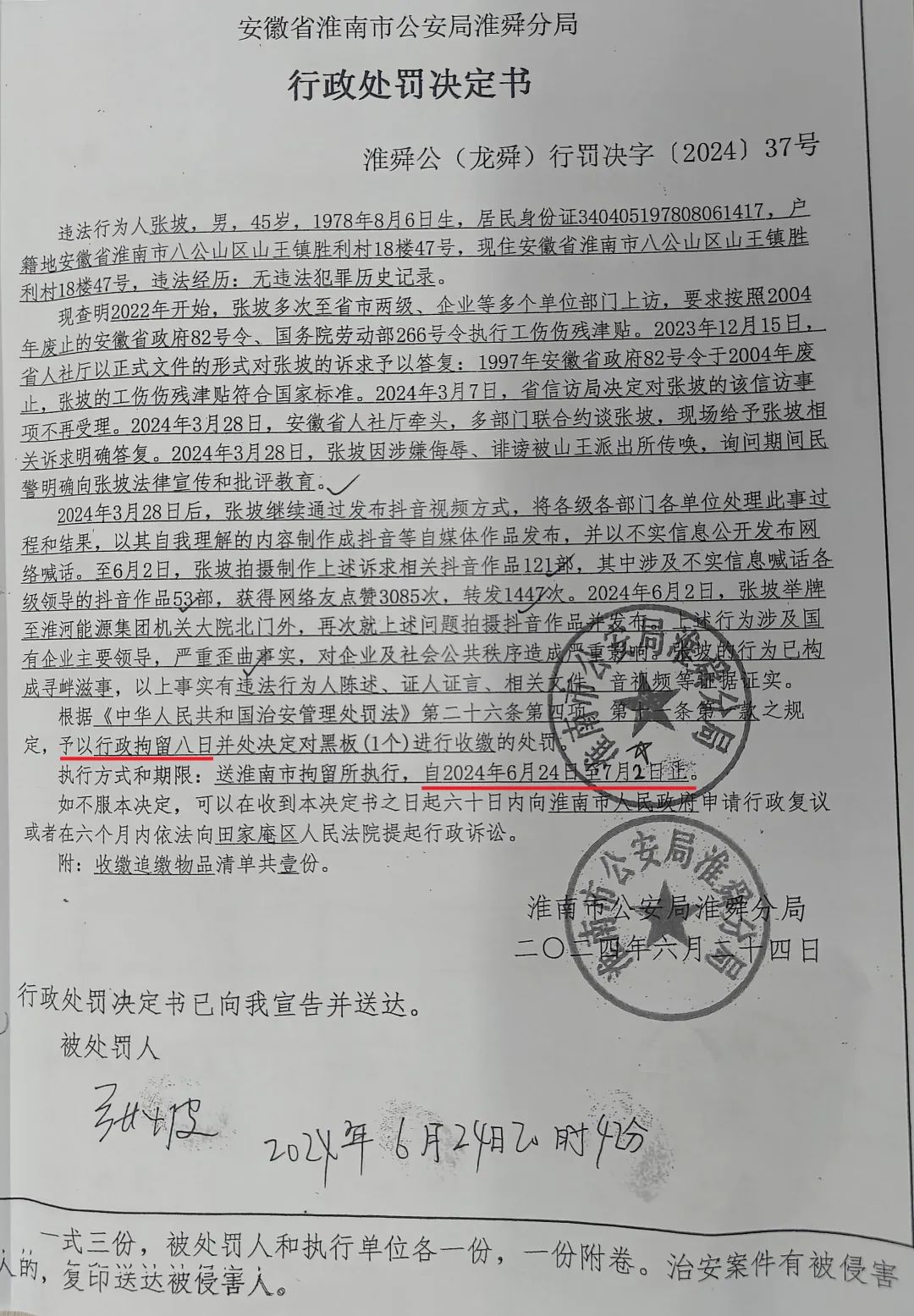 2024年6月2号这天,张坡再次来到淮河能源控股集团大门前,举着写有“实名举报”等内容的牌子,并拍摄视频,期间与前来制止的单位工作人员发生纠纷,随后张坡拨打了110报警处理。