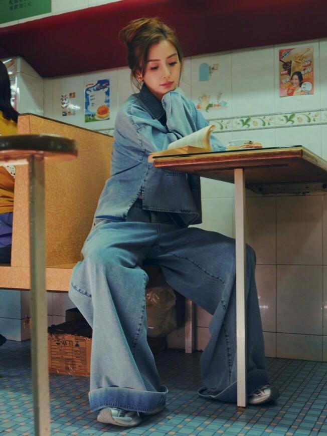 春天正是穿牛仔外套的季节,牛仔夹克搭配牛仔阔腿裤,搭配白色运动鞋,让人不禁为之倾倒。