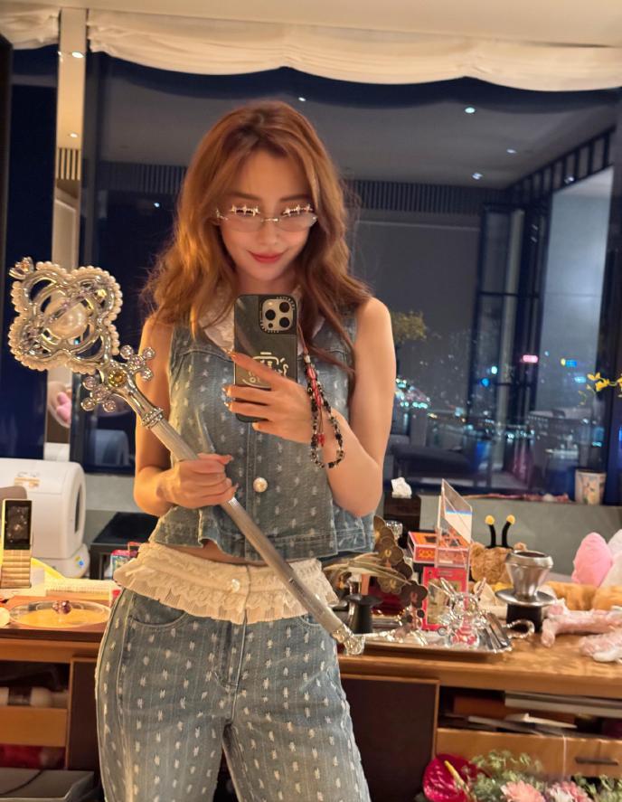 白色蕾丝拼接无袖牛仔背心,搭配白色蕾丝花边的裤子,头发染成黄棕色,佩戴设计感的眼镜!整个一个20多岁的摩登女郎!哪里像生过娃的样子!