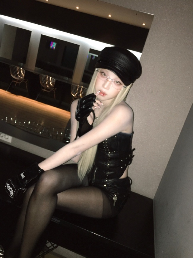 而下身搭配的黑色丝袜,更是这组造型的点睛之笔。丝袜的材质轻薄而富有质感,紧紧包裹着她修长笔直的美腿,仿佛给双腿披上了一层梦幻的薄纱。随着她的每一个动作,丝袜微微闪烁着光泽,与黑色抹胸相互呼应,刚柔并济,营造出一种独特的视觉冲击,让人的目光不自觉地被吸引。