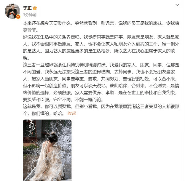 标题:于正辟谣员工是表妹:明确划清工作与亲友界限