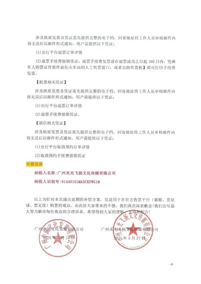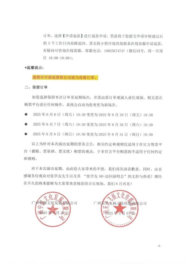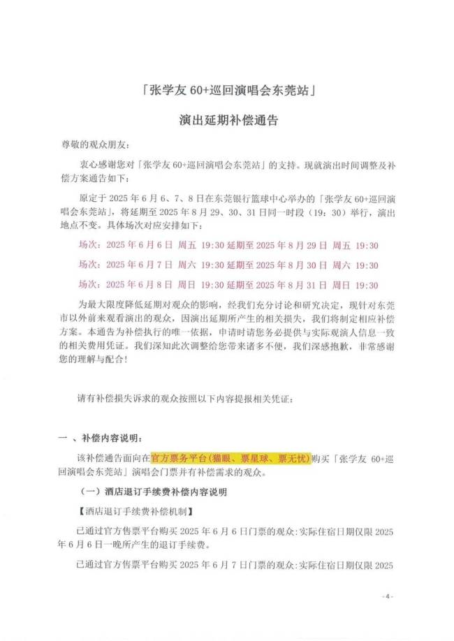 “张学友60+巡回演唱会东莞站”主办方同步发布了“演唱会延期票务通告”和“补偿通告”。主办方表示,将尽最大努力解决观众的合理诉求,已购票观众可选择保留门票观看延期演唱会,无需任何操作,系统将自动变更为新场次;选择退票的观众,可通过原购票平台申请全额退款;因演出延期产生的酒店退订手续费和机票、火车票退票手续费相关损失,也将给予相应的补偿。