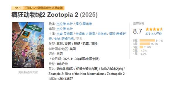 口碑方面,《疯狂动物城2》同样不负众望。在素来严苛的豆瓣平台,首日开分便达到8.7分,超过2.7万名观众参与评分,其中五星好评占比过半(51.7%)。猫眼和淘票票两大购票平台更是双双给出了9.7分的超高评价,而国际权威影评网站烂番茄的新鲜度也定格在93%,可谓全线飘红。