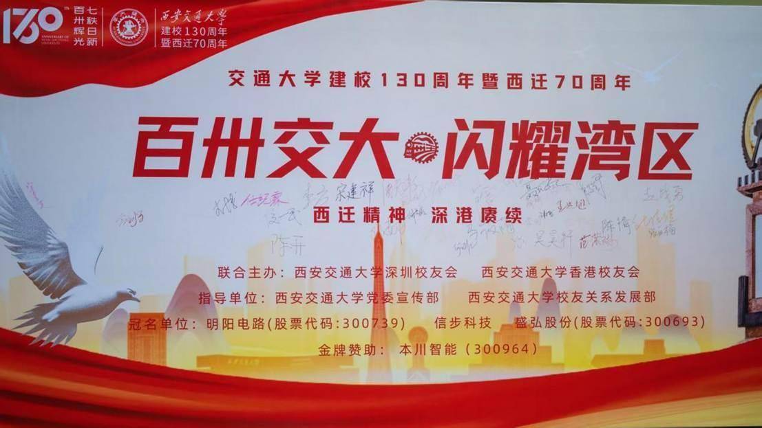 为庆祝西安交通大学建校130周年暨西迁70周年,传承弘扬“胸怀大局、无私奉献、弘扬传统、艰苦创业”的西迁精神,展现交大人与深港特区同频共振的家国情怀,西安交通大学深圳校友会、香港校友会于3月29日隆重举办“百卅交大,闪耀湾区——交通大学建校130周年暨西迁70周年”校庆主题纪念活动。西安市政府驻深办主任杨霄,西安交大深圳校友会会长、明阳电路(SZ: 300739)董事长张佩珂,西安交大香港校友会会长、晶科电子(HK:02551)董事长肖国伟出席了活动并致辞。上海交大、北京交大、西南交大、台湾交通大学、高校校友联合平台、陕西各高校校友会负责人等嘉宾出席了活动。