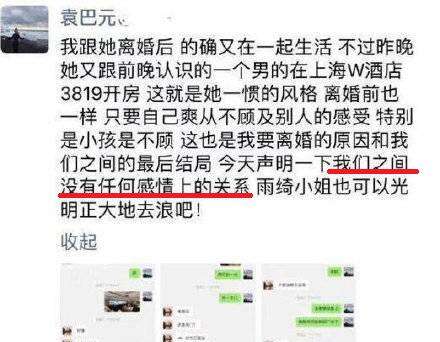 当初张雨绮跟第二任丈夫袁巴元被传感情不和的时候,闹得很不愉快,袁巴元在朋友圈多番控诉张雨绮。后来两人离婚的消息,是张雨绮的经纪人杨天真代为宣布的。