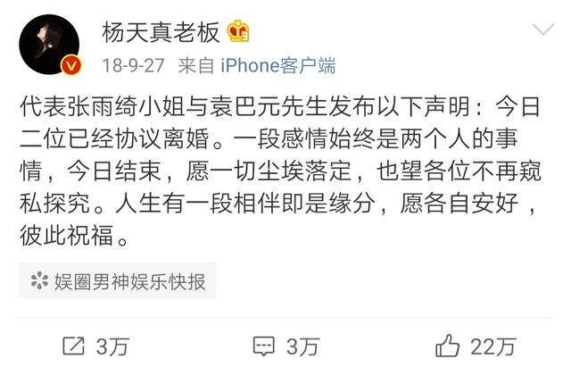 虽然杨天真的用词是“愿各自安好,彼此祝福”,但实际上两人还是闹得很不愉快,袁巴元在朋友圈的发文也是很绝情了。