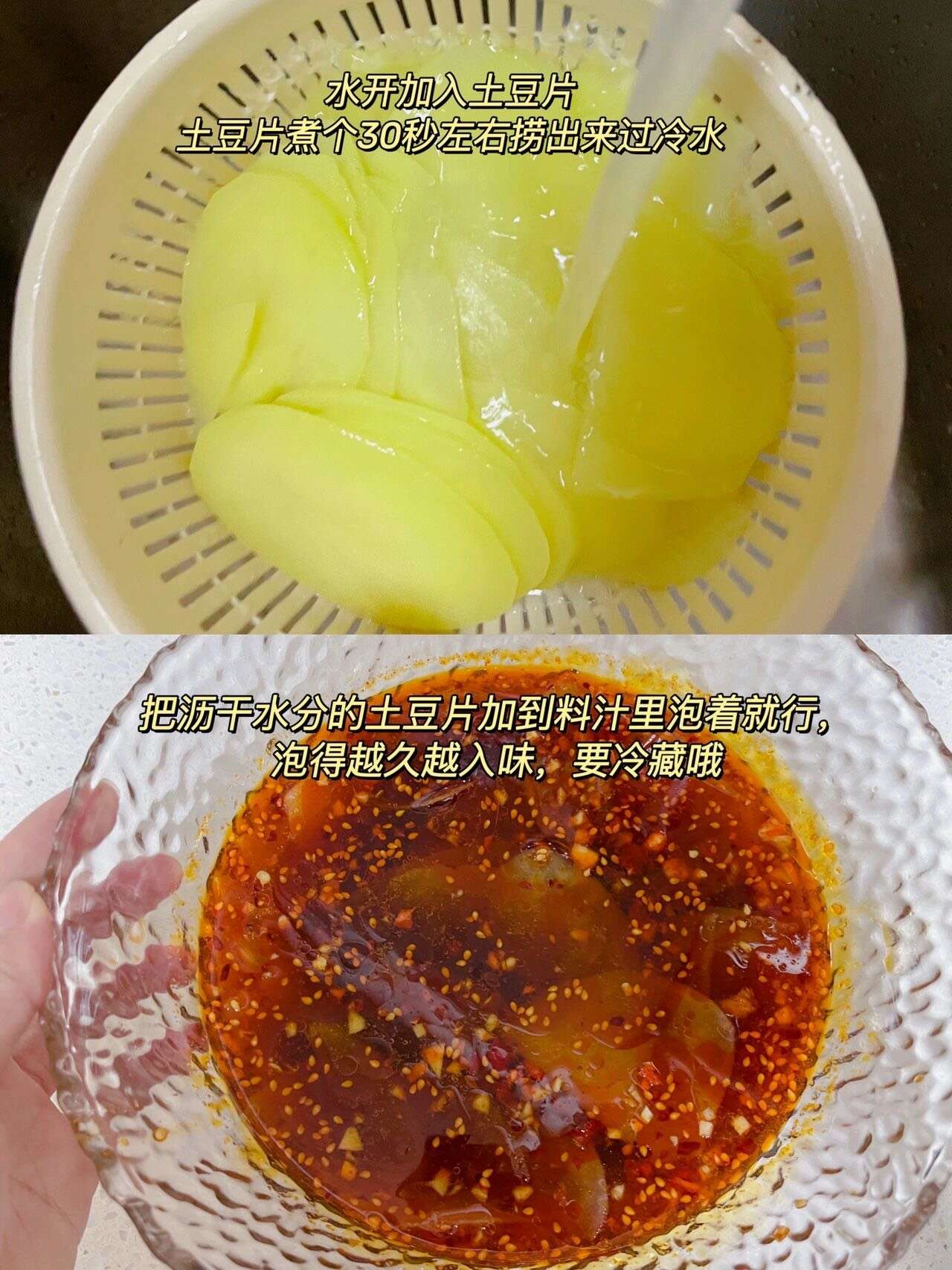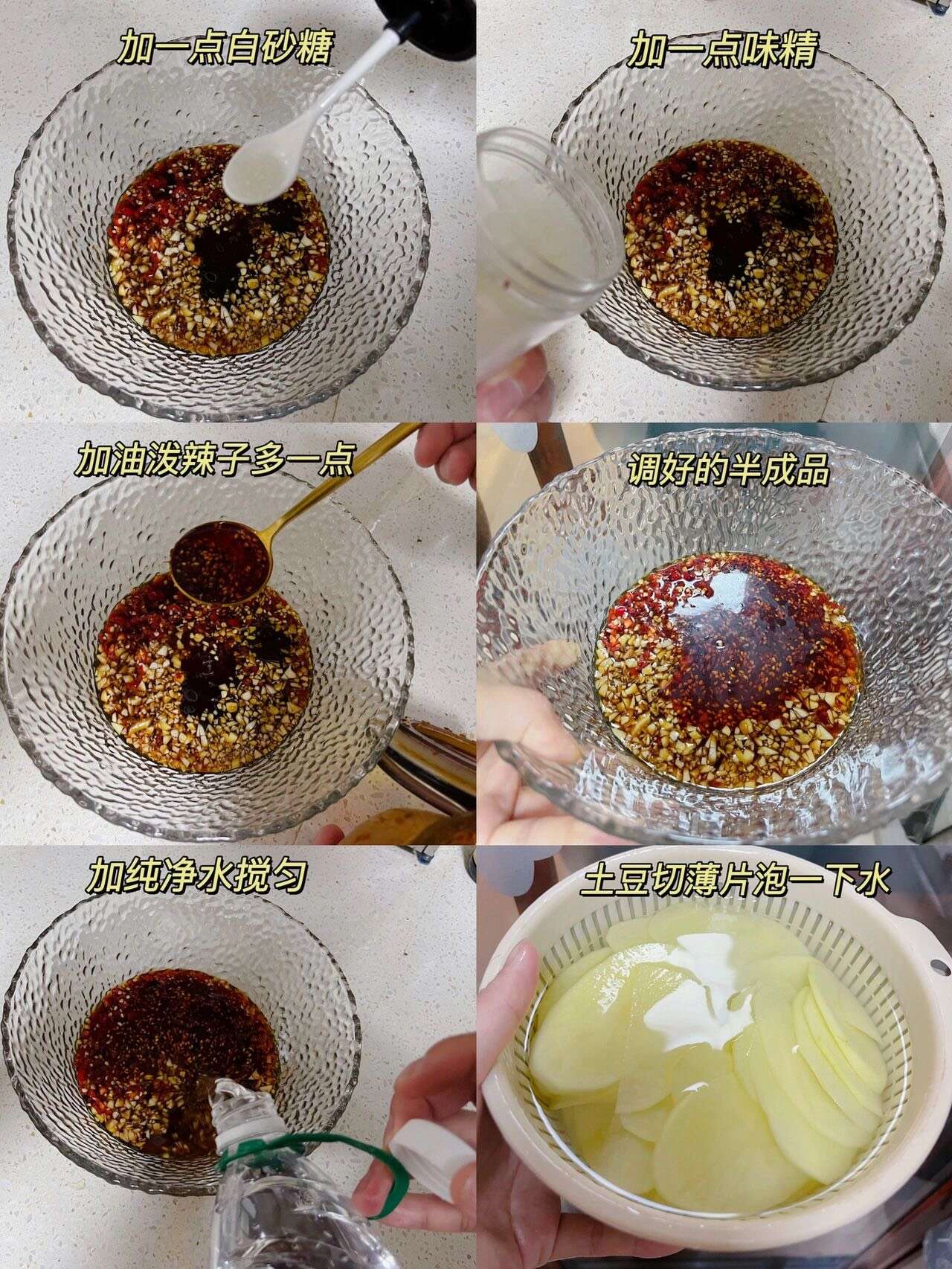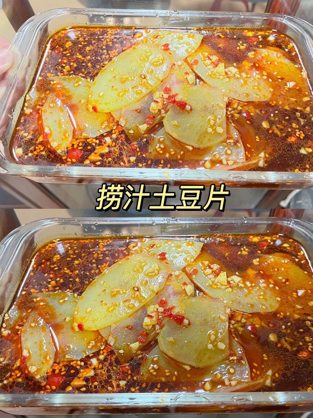 捞汁土豆片,我妈说可以出摊了!这个料汁,可以泡一些素菜和荤菜,捞汁小海鲜同理 荤菜的话把海鲜焯水煮熟直接泡着就行了 素菜也是一样,焯水,不要煮太熟,不然就没有爽脆的口感了,素菜焯水出锅过一下凉水,口感会更好 料汁调好以后根据自己个人口味再调节咸淡 做好一定要冷藏!