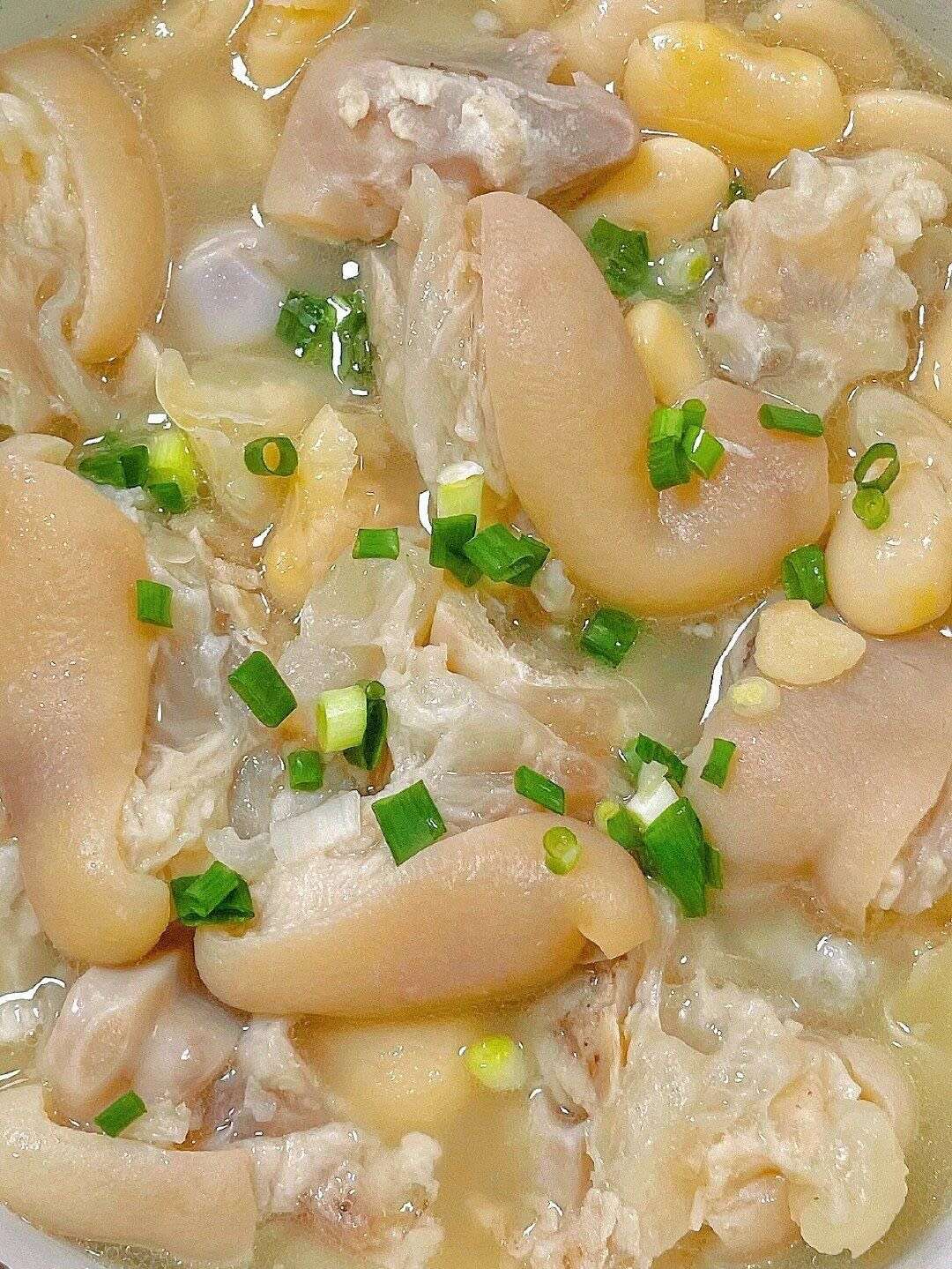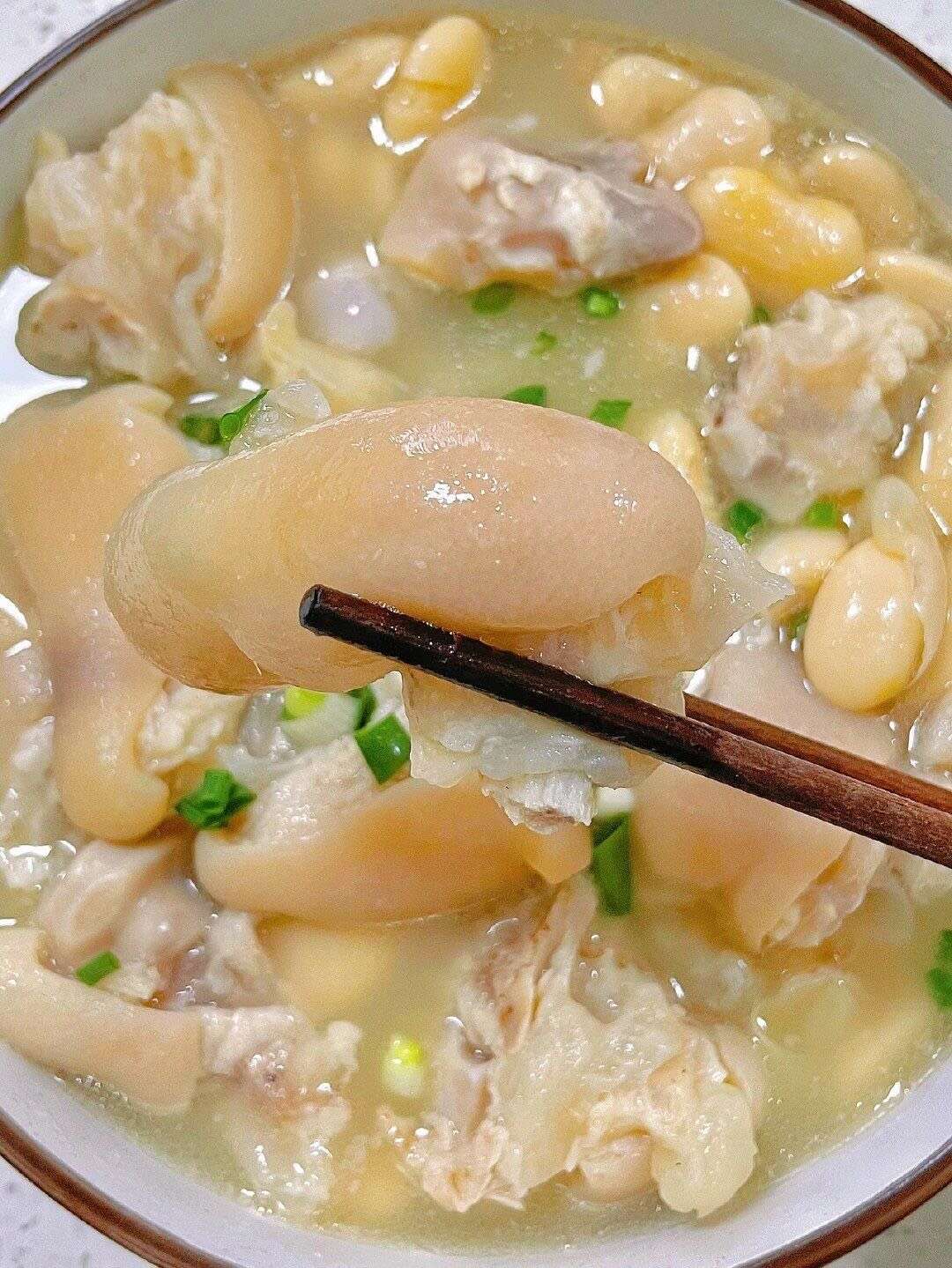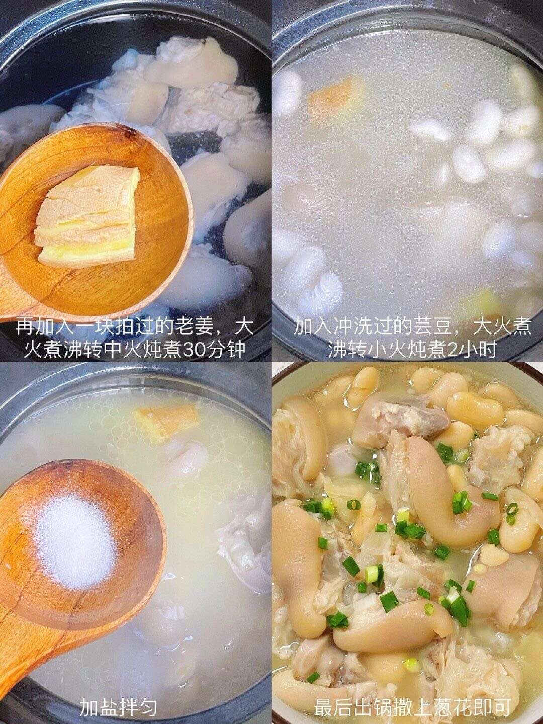 猪蹄具有强壮骨骼 补气血 美容养颜的功效 吃法也有很多种 这种芸豆蹄花汤的做法你可有吃过~ 芸豆蹄花汤的做法 1、芸豆用温水泡一晚 2、将猪脚洗净 切小块 加入姜片 料酒 葱叶焯水 捞出热水冲洗干净血沫备用 3、猪蹄放入砂锅中 适量多加入清水 再加一块拍过的老姜 大火煮沸转中火炖煮30分钟 4、泡一晚的芸豆洗干净加入 大火煮沸转小火炖煮2小时 5、加盐搅均 (喜欢鸡精的可以加入)出锅撒上葱花即可 6、蘸水:葱花 蒜末 小米辣剁碎 辣椒粉一起放碗中 然后锅中加油烧热泼油 加适量鸡精 花椒粉 生抽 原汤拌均即可
