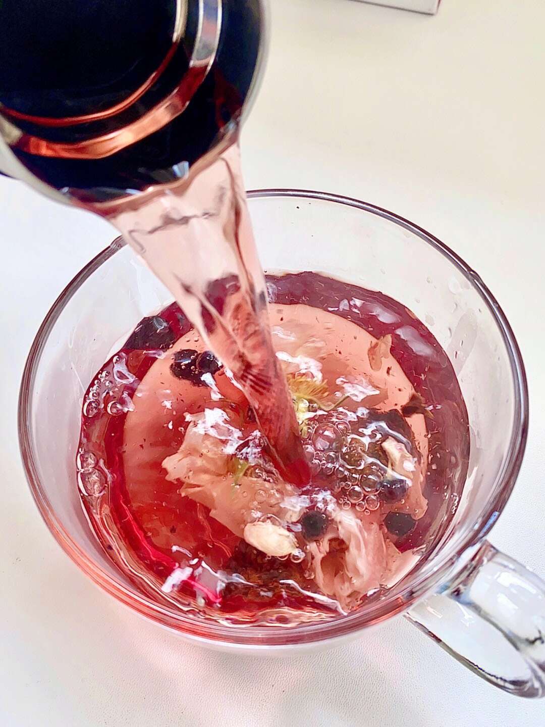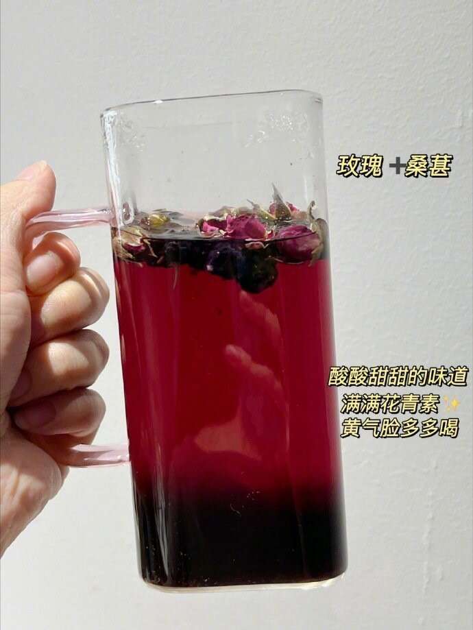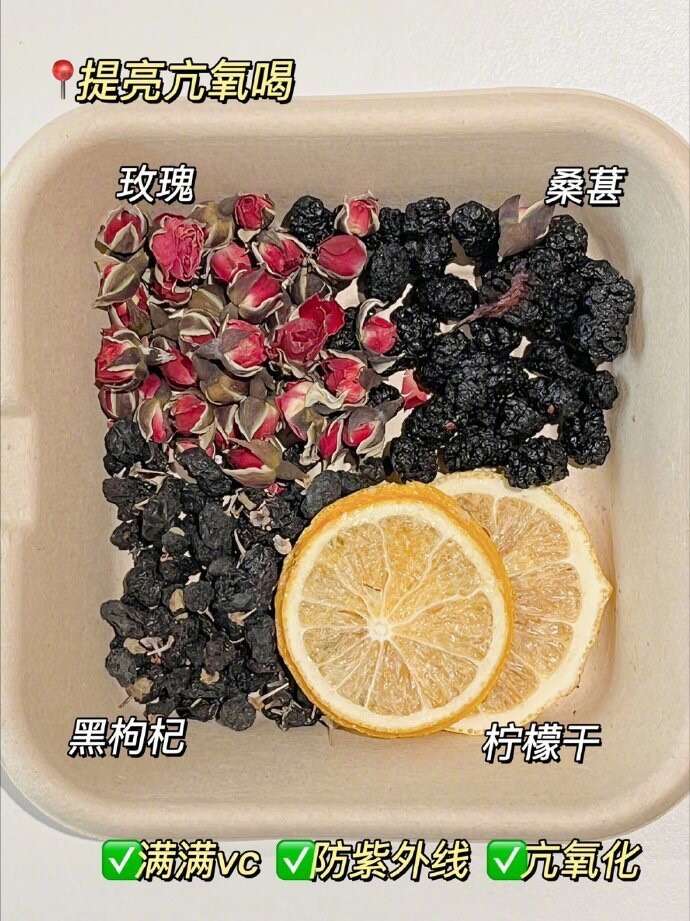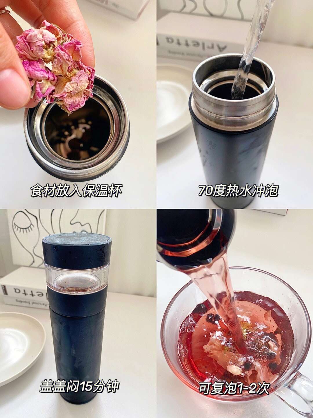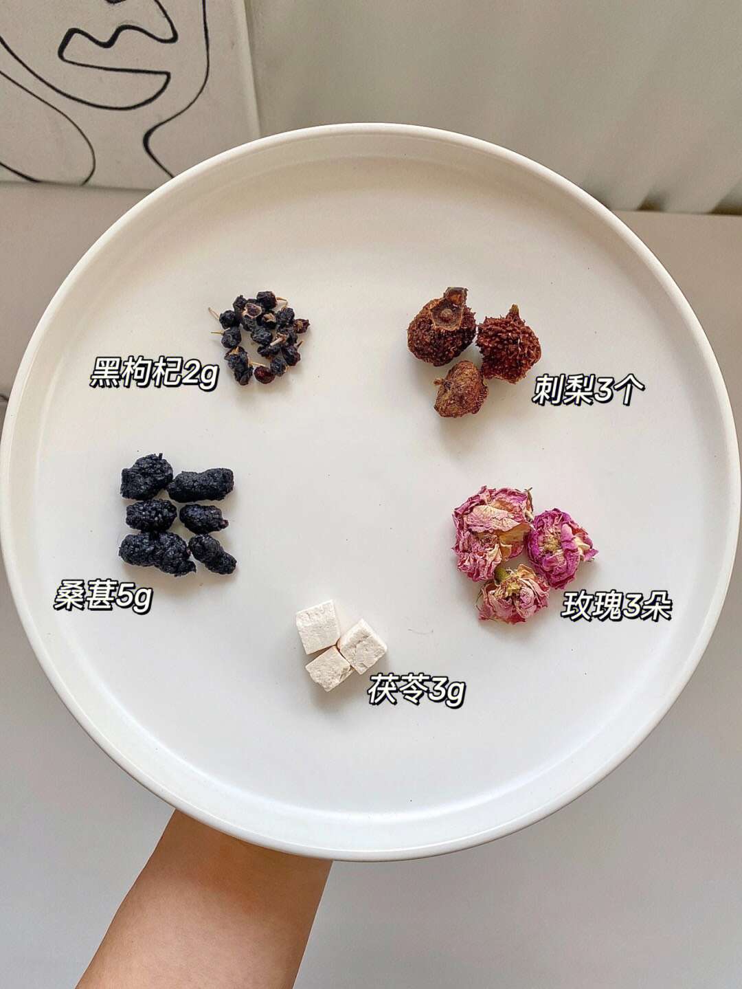 ?黑枸杞2g、桑葚5g、玫瑰3朵、刺梨3颗、茯苓3g ✅食材倒入保温杯,70度左右热水冲泡,盖盖闷15分钟,倒出来就可以喝啦~