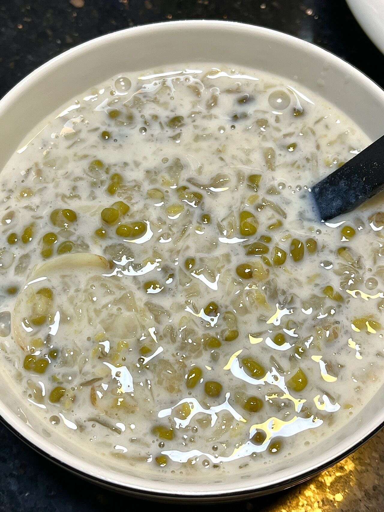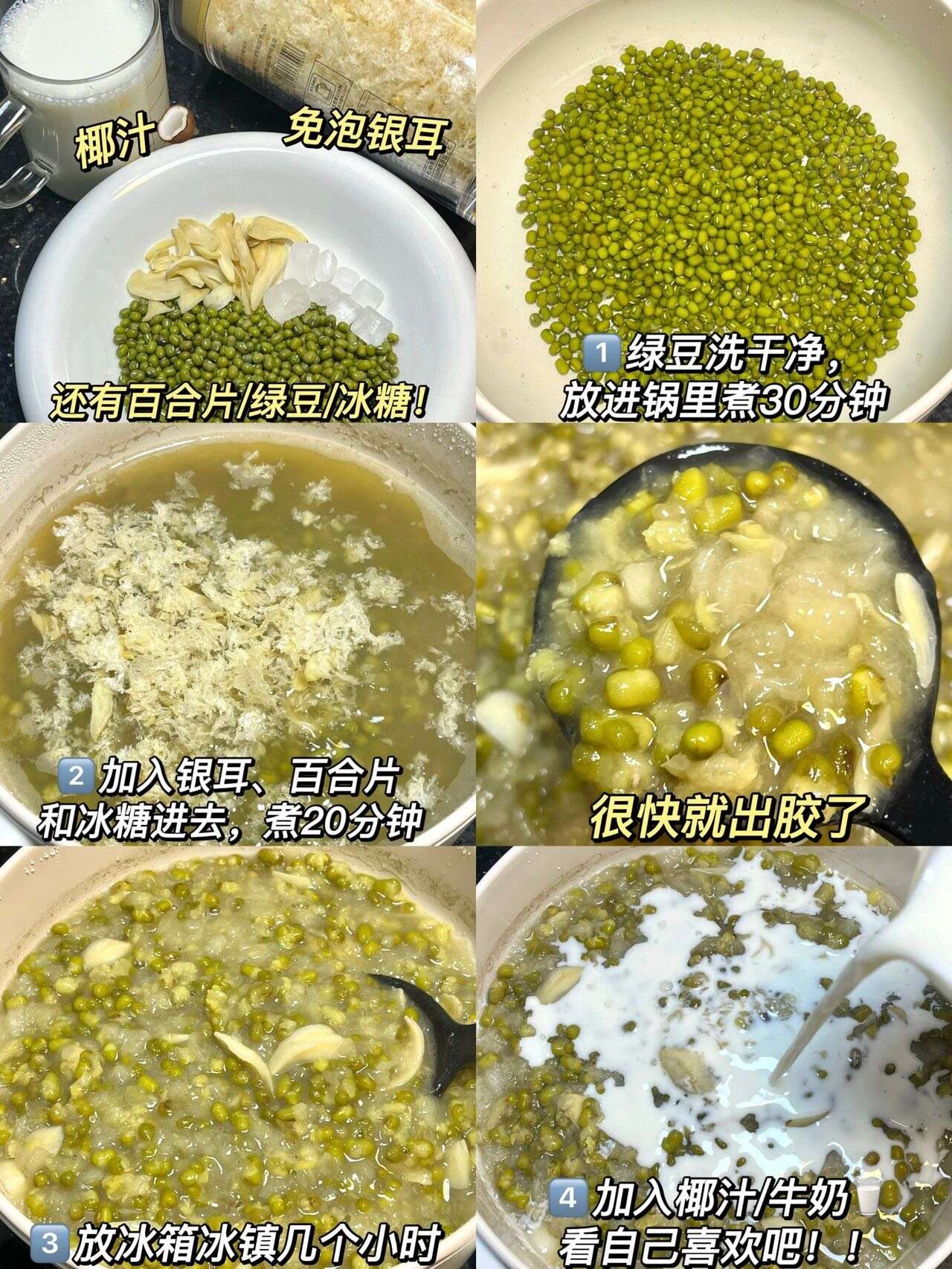 夏季喝出来好皮肤! 清凉下火又健康!入口滑嫩嫩的! 食材:银耳、绿豆、百合片、冰糖、椰汁 缺点是绿豆是寒性的,女孩不能经常喝!