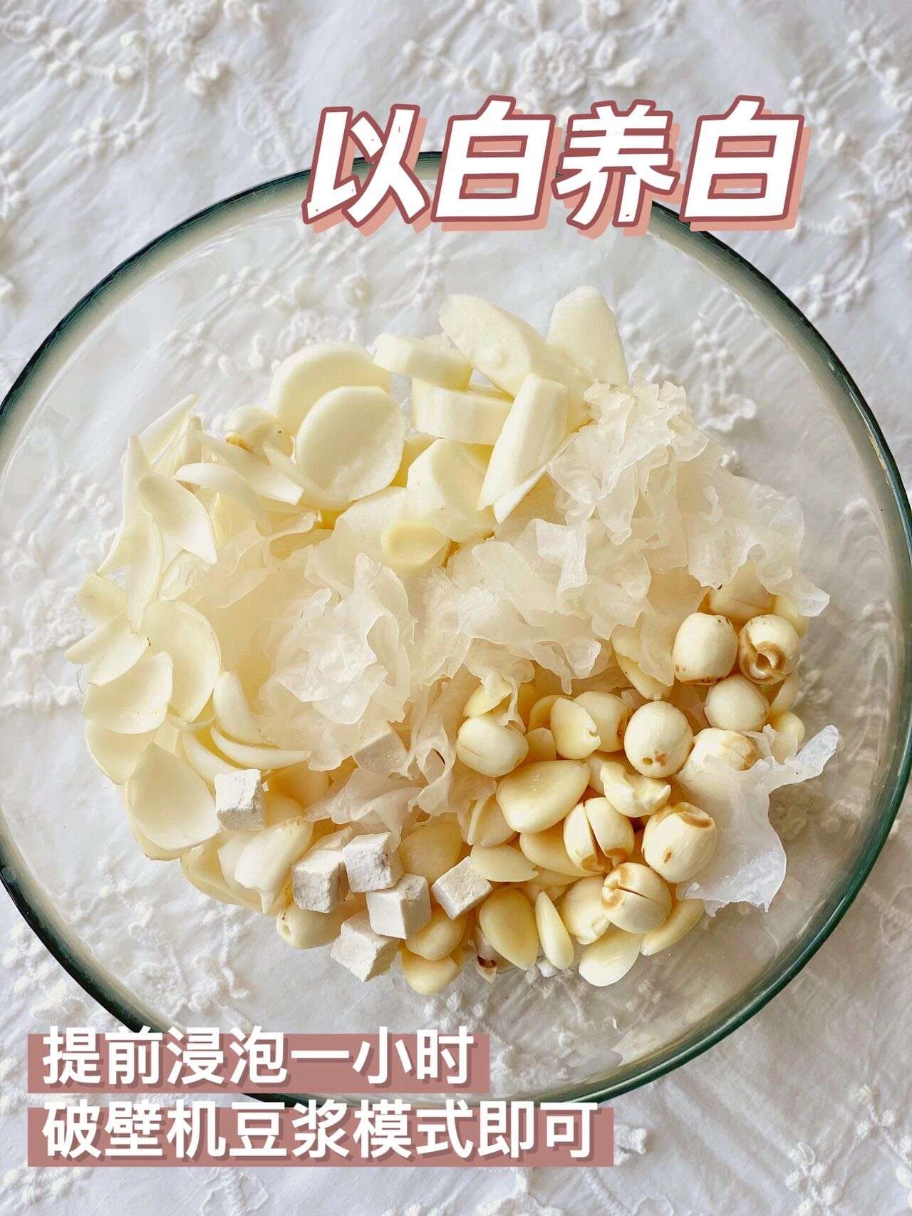 山药杏仁露 连喝2周!感觉自己皮肤白皙水嫩!内调真的很重要! 食材:南杏仁20g+百合10g+银耳小半朵+山药20g+莲子10g+茯苓5g 做法:全部食材倒入破壁机,加入750毫升水,豆浆模式即可