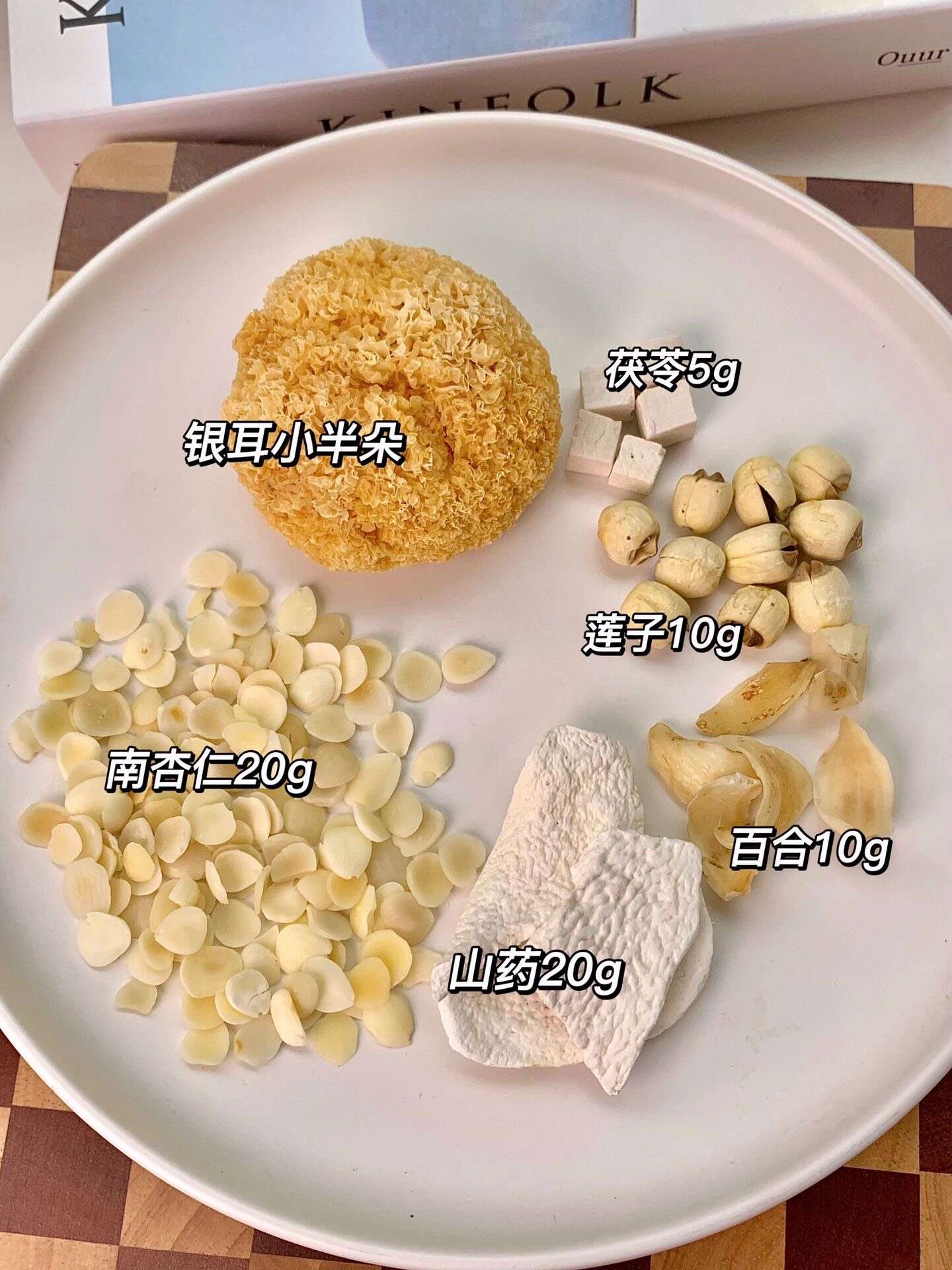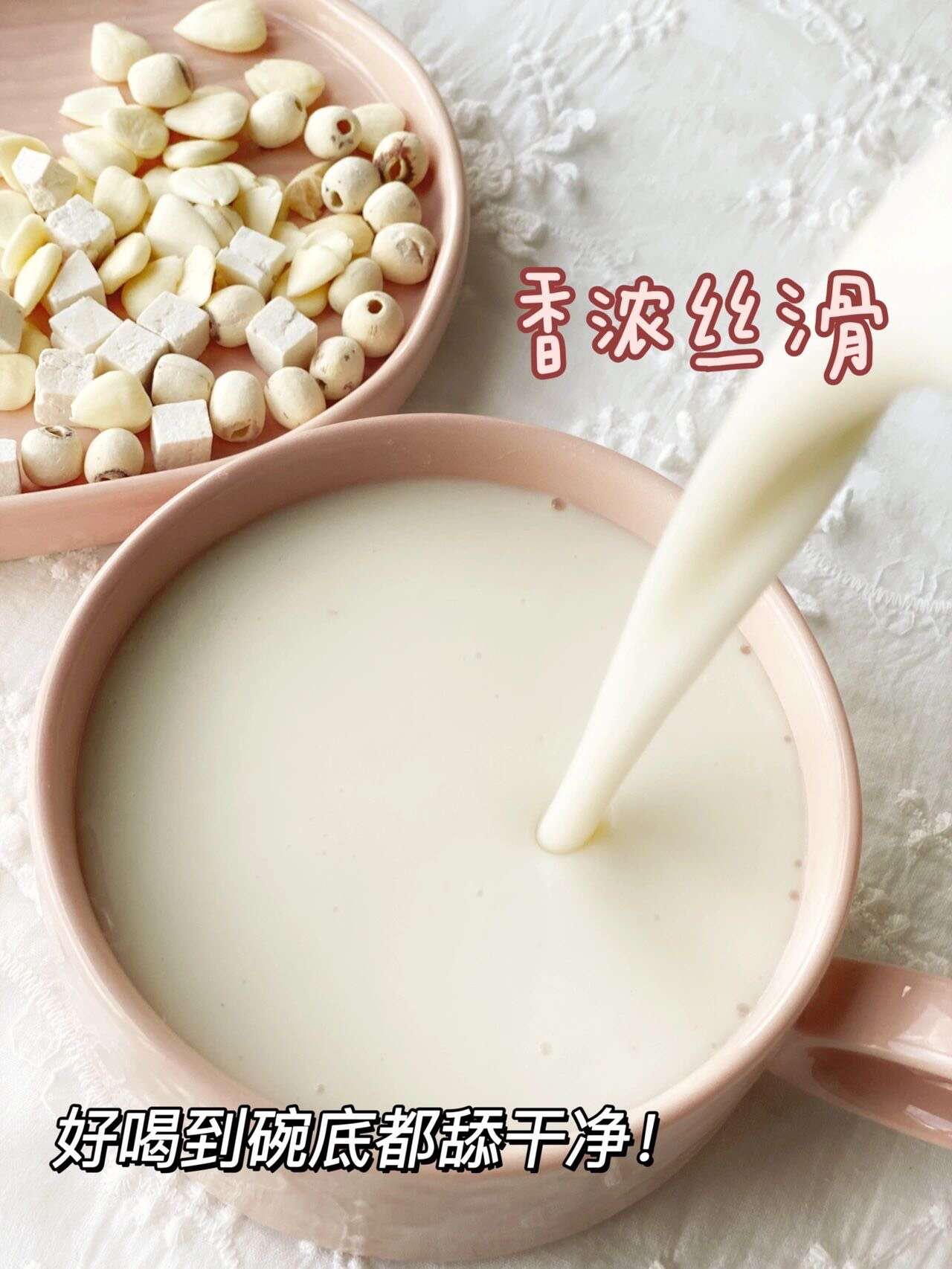 山药半根,杏仁30g,莲子 20g,鲜百合1颗,茯苓10粒,银耳1小朵,纯牛奶+水1000ml 口感细腻顺滑~喜爱吃甜的可加点糖蜂蜜,或者玫瑰花酱,口感更好!!