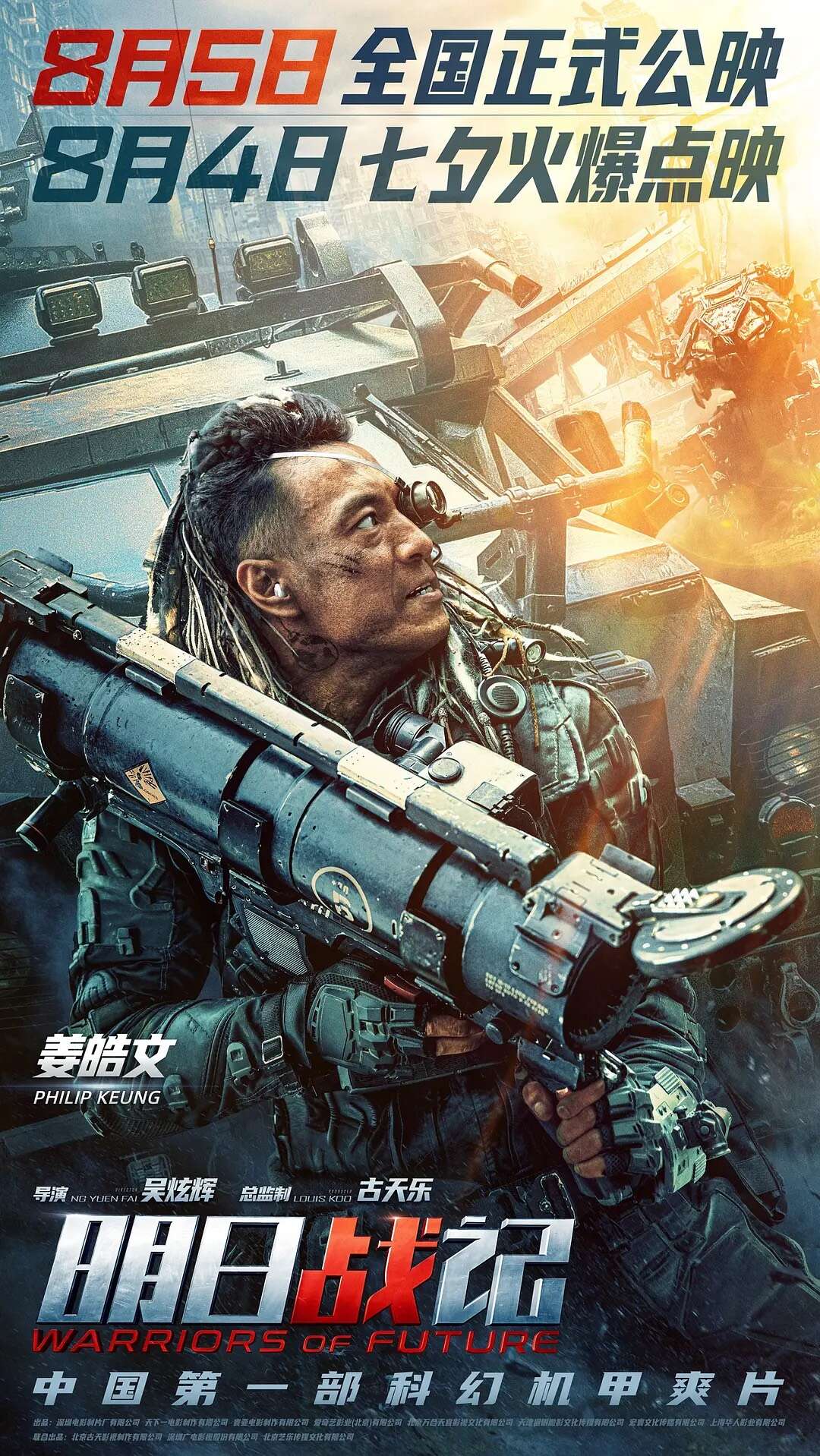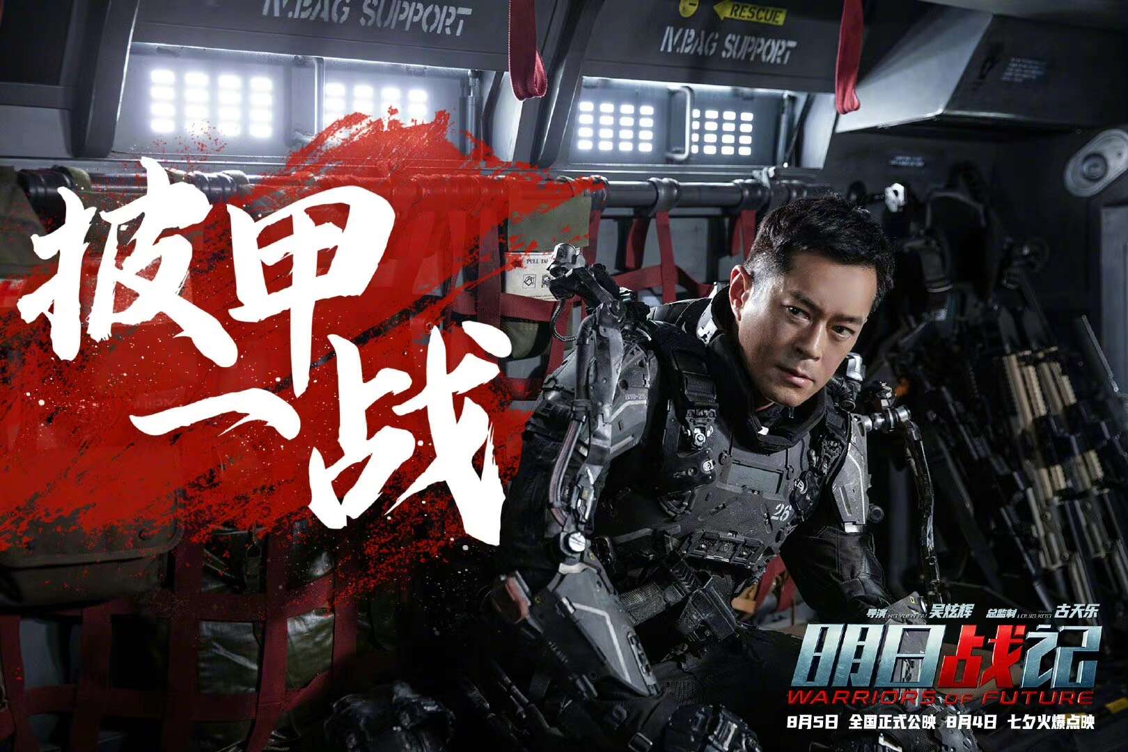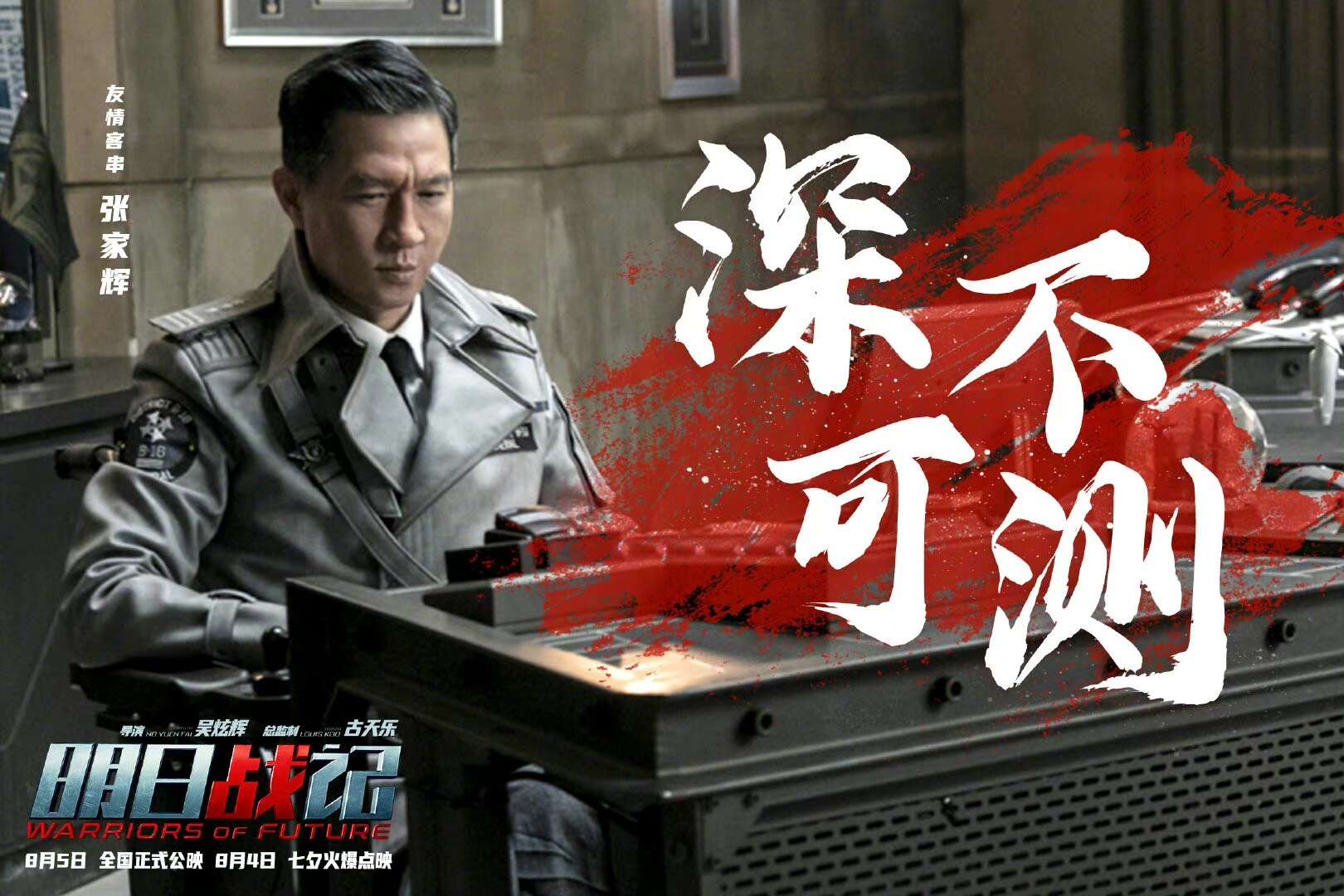 电影《明日战记》海报并提档,由吴炫辉执导,古天乐担任总监制,古天乐、刘青云、刘嘉玲等主演,张家辉友情客串的机甲硬科幻机甲战队全员集结,身处未来战场的战火之中。影片将于8月5日正式公映,8月4日七夕点映,目前预售已开启。